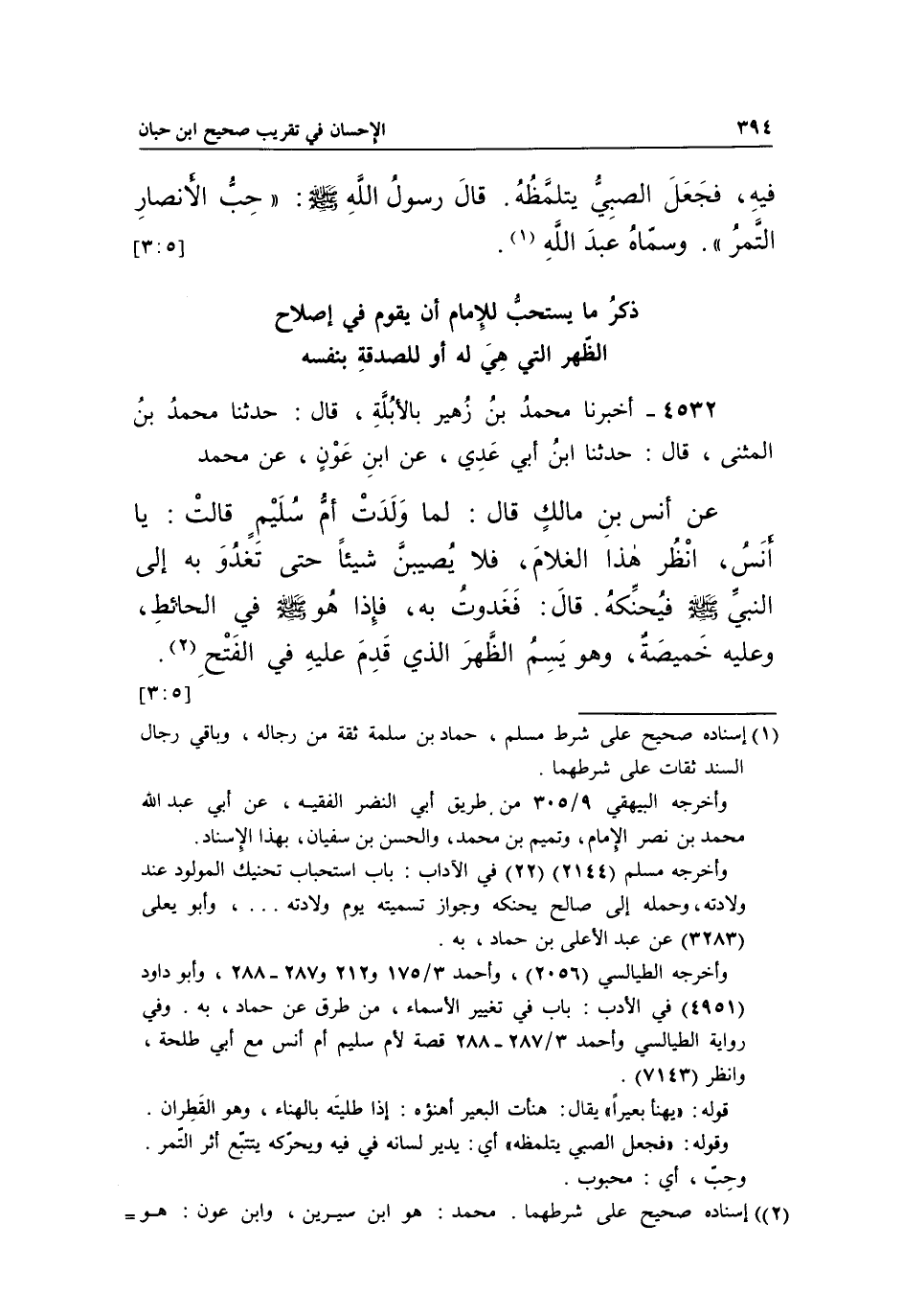 4532 - أَخْبَرَنَا مُحَمَّدُ بْنُ زُهَيْرٍ بِالْأُبُلَّةِ، قَالَ: حَدَّثَنَا مُحَمَّدُ بْنُ الْمُثَنَّى، قَالَ: حَدَّثَنَا بن أَبِي عَدِيٍّ، عَنِ ابْنِ عَوْنٍ، عَنْ مُحَمَّدٍ عَنْ أَنَسِ بْنِ مَالِكٍ قَالَ: لَمَّا وَلَدَتْ أُمُّ سُلَيْمٍ قَالَتْ: يَا أَنَسُ، انْظُرْ هَذَا الْغُلَامَ، فَلَا يُصِيبَنَّ شَيْئًا حَتَّى تَغْدُوَ بِهِ إِلَى النَّبِيِّ صَلَّى اللَّهُ عَلَيْهِ وَسَلَّمَ فَيُحَنِّكُهُ، قَالَ: فَغَدَوْتُ بِهِ، فَإِذَا هُوَ صَلَّى اللَّهُ عَلَيْهِ وَسَلَّمَ فِي الْحَائِطِ، وَعَلَيْهِ خَمِيصَةٌ، وَهُوَ يَسِمُ الظَّهْرَ الَّذِي قَدِمَ عَلَيْهِ فِي الْفَتْحِ1.
