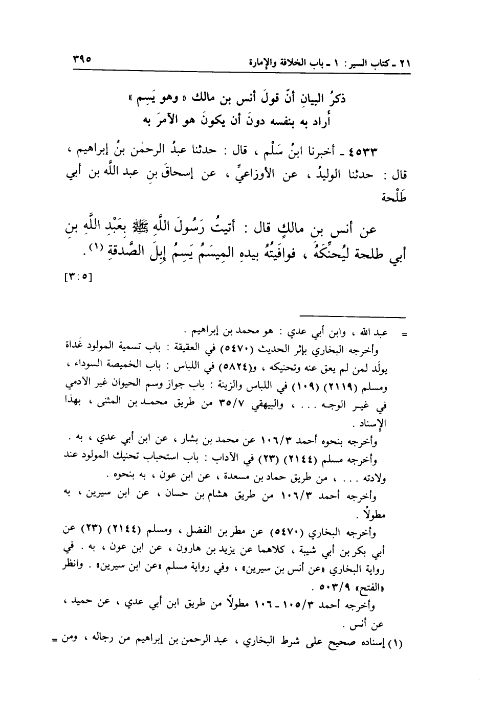 4533 - أَخْبَرَنَا ابْنُ سَلْمٍ، قَالَ: حَدَّثَنَا عَبْدُ الرَّحْمَنِ بْنُ إِبْرَاهِيمَ، قَالَ: حَدَّثَنَا الْوَلِيدُ، عَنِ الْأَوْزَاعِيِّ، عَنْ إِسْحَاقَ بْنِ عَبْدِ اللَّهِ بْنِ أَبِي طلحة عَنْ أَنَسِ بْنِ مَالِكٍ قَالَ: أَتَيْتُ رَسُولَ اللَّهِ صَلَّى اللَّهُ عَلَيْهِ وَسَلَّمَ بِعَبْدِ اللَّهِ بْنِ أَبِي طَلْحَةَ لِيُحَنِّكَهُ، فَوَافَيْتُهُ بِيَدِهِ الْمِيسَمُ يَسِمُ إِبِلَ الصدقة1.