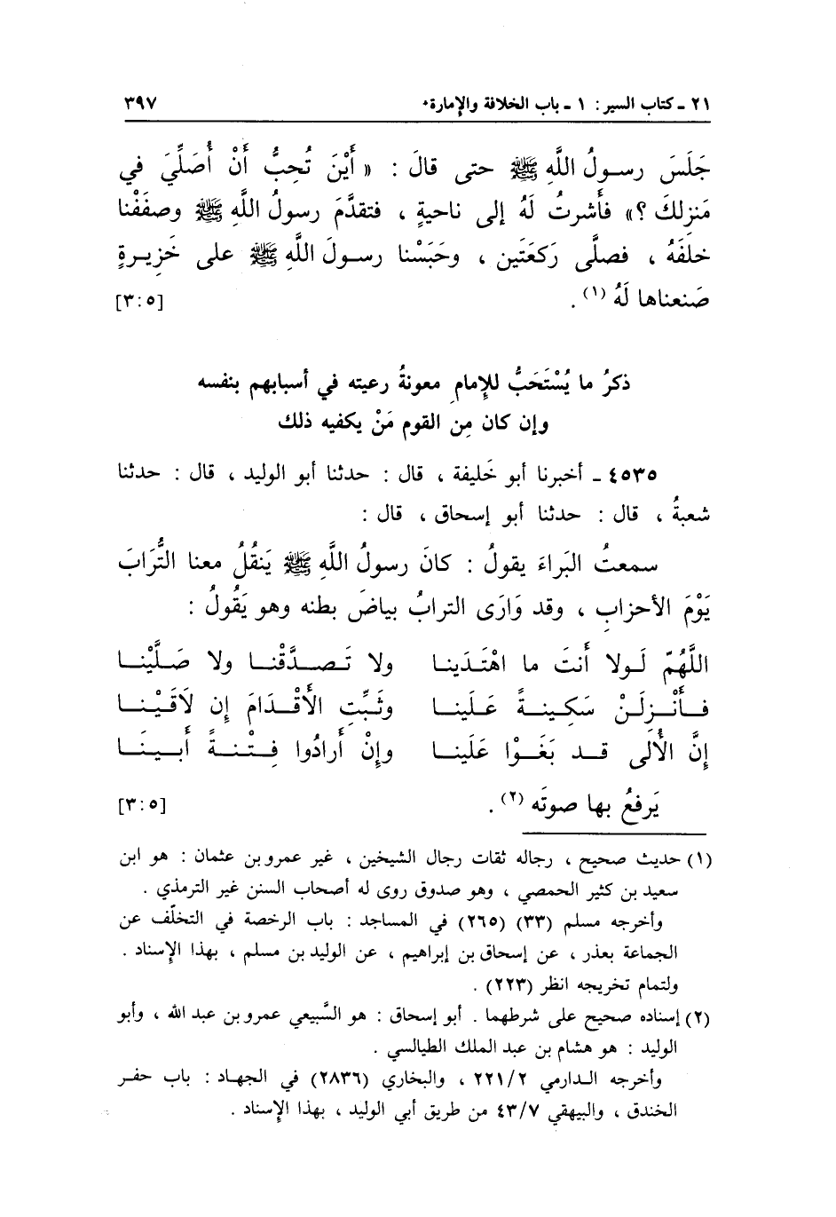 4535 - أَخْبَرَنَا أَبُو خَلِيفَةَ، قَالَ: حَدَّثَنَا أَبُو الْوَلِيدِ، قَالَ: حَدَّثَنَا شُعْبَةُ، قَالَ: حَدَّثَنَا أَبُو إِسْحَاقَ، قَالَ: سَمِعْتُ الْبَرَاءَ يَقُولُ: كَانَ رَسُولُ اللَّهِ صَلَّى اللَّهُ عَلَيْهِ وَسَلَّمَ يَنْقِلُ مَعَنَا التُّرَابَ يَوْمَ الْأَحْزَابِ، وَقَدْ وَارَى التُّرَابُ بَيَاضَ بَطْنِهِ وَهُوَ يَقُولُ: