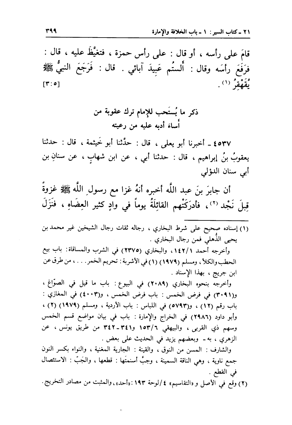 4537 - أَخْبَرَنَا أَبُو يَعْلَى، قَالَ: حَدَّثَنَا أَبُو خَيْثَمَةَ، قَالَ: حَدَّثَنَا يَعْقُوبُ بْنُ إِبْرَاهِيمَ، قَالَ: حَدَّثَنَا أَبِي، عَنِ ابْنِ شِهَابٍ، عَنْ سِنَانَ بْنِ أَبِي سِنَانَ الدُّؤَلِيِّ أَنَّ جَابِرَ بْنَ عَبْدِ اللَّهِ أَخْبَرَهُ أَنَّهُ غَزَا مَعَ رَسُولِ اللَّهِ صَلَّى اللَّهُ عَلَيْهِ وَسَلَّمَ غَزْوَةً قَبْلَ نَجْدٍ1، فَأَدْرَكَتْهُمُ الْقَائِلَةُ يوما في واد كثير العضاة، فنزل