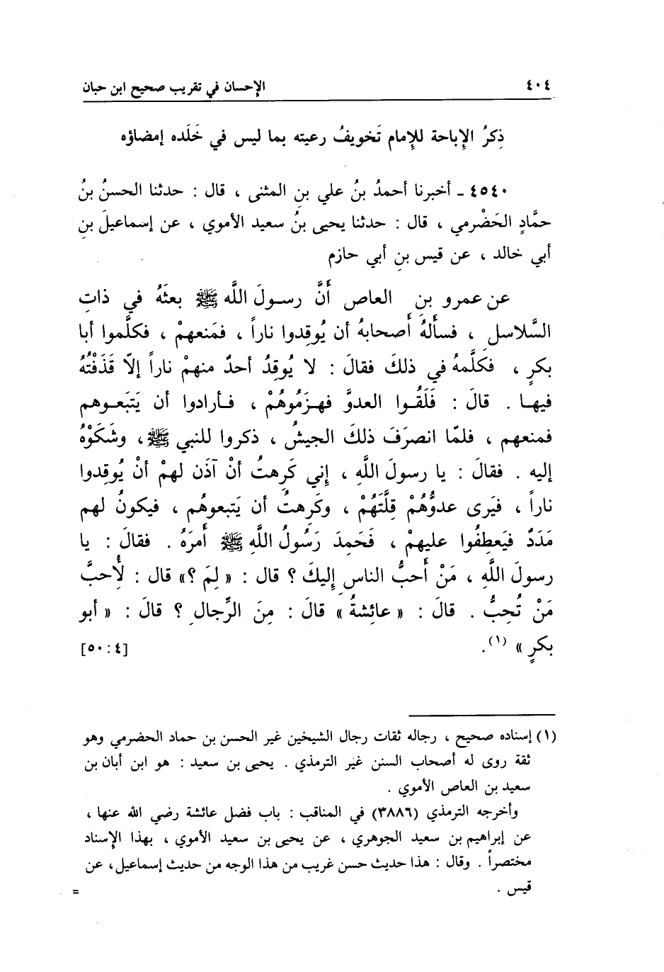 4540 - أَخْبَرَنَا أَحْمَدُ بْنُ عَلِيِّ بْنِ الْمُثَنَّى، قَالَ: حَدَّثَنَا الْحَسَنُ بْنُ حَمَّادٍ الْحَضْرَمِيُّ، قَالَ: حَدَّثَنَا يَحْيَى بْنُ سَعِيدٍ الْأُمَوِيُّ، عَنْ إِسْمَاعِيلَ بْنِ أَبِي خَالِدٍ، عَنْ قَيْسِ بْنِ أَبِي حَازِمٍ عَنْ عَمْرِو بْنِ الْعَاصِ أَنَّ رَسُولَ اللَّهِ صَلَّى الله عليه وسلم بَعَثَهُ فِي ذَاتِ السَّلَاسِلِ، فَسَأَلَهُ أَصْحَابُهُ أَنْ يُوقِدُوا نَارًا، فَمَنَعَهُمْ، فَكَلَّمُوا أَبَا بَكْرٍ، فَكَلَّمَهُ فِي ذَلِكَ فَقَالَ: لَا يُوقِدُ أَحَدٌ مِنْهُمْ نَارًا إِلَّا قَذَفْتُهُ فِيهَا. قَالَ: فَلَقُوا الْعَدُوَّ فَهَزَمُوهُمْ، فَأَرَادُوا أَنْ يَتَّبِعُوهُمْ، فَمَنَعَهُمْ فَلَمَّا انْصَرَفَ ذَلِكَ الْجَيْشُ، ذَكَرُوا لِلنَّبِيِّ صَلَّى اللَّهُ عَلَيْهِ وَسَلَّمَ، وَشَكَوْهُ إِلَيْهِ. فَقَالَ: يَا رَسُولَ اللَّهِ، إِنِّي كَرِهْتُ أَنْ آذَنَ لَهُمْ أَنْ يُوقِدُوا نَارًا، فَيَرَى عَدُوُّهُمْ قِلَّتَهُمْ، وَكَرِهْتُ أَنْ يَتَّبِعُوهُمْ، فَيَكُونُ لَهُمْ مَدَدٌ فَيُعْطِفُوا عَلَيْهِمْ، فَحَمِدَ رَسُولِ اللَّهِ صَلَّى اللَّهُ عَلَيْهِ وَسَلَّمَ أَمْرَهُ، فَقَالَ: يَا رَسُولَ اللَّهِ، مَنْ أَحَبُّ النَّاسِ إِلَيْكَ؟ قَالَ: "لِمَ؟ " قَالَ: لَأُحِبُّ مَنْ تُحِبُّ. قَالَ: "عَائِشَةُ" قَالَ: مِنَ الرِّجَالِ؟ قَالَ: "أَبُو بَكْرٍ"1.