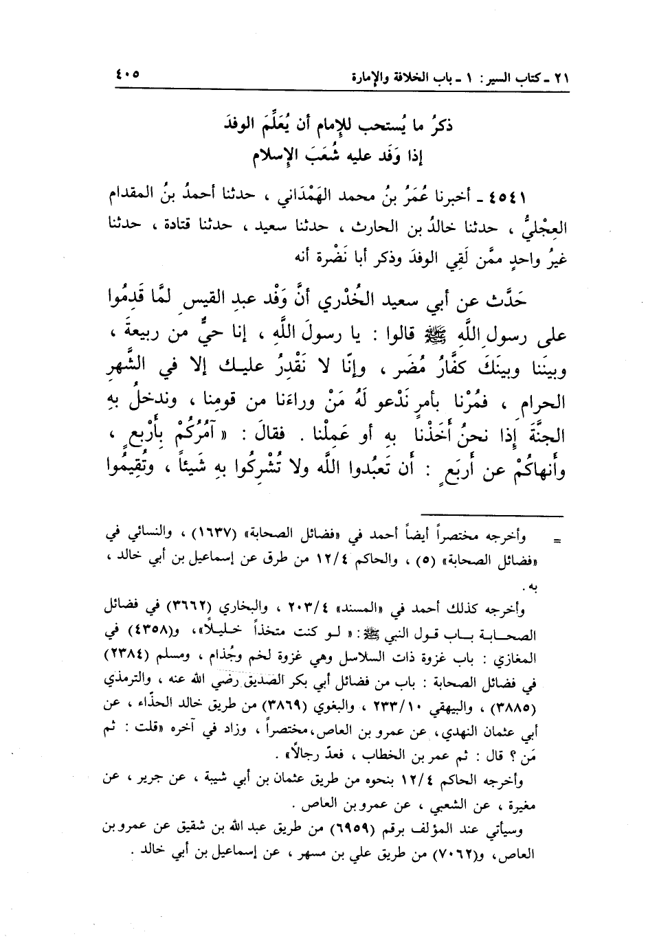 4541 - أَخْبَرَنَا عُمَرُ بْنُ مُحَمَّدٍ الْهَمْدَانِيُّ، حَدَّثَنَا أَحْمَدُ بْنُ الْمِقْدَامِ الْعِجْلِيُّ، حَدَّثَنَا خَالِدُ بْنُ الْحَارِثِ، حَدَّثَنَا سَعِيدٌ، حَدَّثَنَا قَتَادَةُ، حَدَّثَنَا غَيْرُ وَاحِدٍ مِمَّنْ لَقِيَ الْوَفْدَ وَذكَرَ أَبَا نَضْرَةَ أَنَّهُ حَدَّثَ عَنْ أَبِي سَعِيدٍ الْخُدْرِيِّ أَنَّ وَفْدَ عَبْدِ الْقَيْسِ لَمَّا قَدِمُوا عَلَى رَسُولِ اللَّهِ صَلَّى اللَّهُ عَلَيْهِ وَسَلَّمَ قَالُوا: يَا رَسُولَ اللَّهِ، إِنَّا حَيٌّ مِنْ رَبِيعَةَ، وَبَيْنَنَا وَبَيْنَكَ كُفَّارُ مُضَرَ، وَإِنَّا لَا نَقْدِرُ عَلَيْكَ إِلَّا فِي الشَّهْرِ الْحَرَامِ، فَمُرْنَا بِأَمْرٍ نَدْعُو لَهُ مَنْ وَرَاءِنَا مِنْ قَوْمِنَا، وَنَدْخُلُ بِهِ الْجَنَّةَ إِذَا نَحْنُ أَخَذْنَا بِهِ أَوْ عَمِلْنَا، فَقَالَ: "آمُرُكُمْ بِأَرْبَعٍ، وَأَنْهَاكُمْ عَنْ أَرْبَعٍ: أَنْ تَعْبُدُوا اللَّهَ وَلَا تُشْرِكُوا بِهِ شَيْئًا، وَتُقِيمُوا