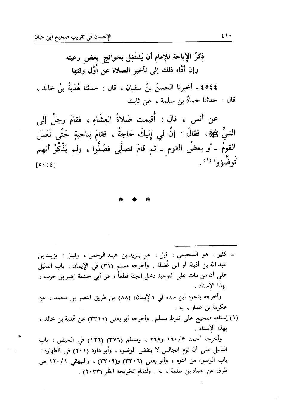 4544 - أَخْبَرَنَا الْحَسَنُ بْنُ سُفْيَانَ، قَالَ: حَدَّثَنَا هُدْبَةُ بْنُ خَالِدٍ، قَالَ: حَدَّثَنَا حَمَّادُ بْنُ سَلَمَةَ، عَنْ ثَابِتٍ عَنْ أَنَسٍ، قَالَ: أُقِيمَتْ صَلَاةُ الْعِشَاءِ، فَقَامَ رَجُلٌ إِلَى النَّبِيِّ صَلَّى اللَّهُ عَلَيْهِ وَسَلَّمَ، فَقَالَ: إِنَّ لِي إِلَيْكَ حَاجَةً، فَقَامَ بِنَاحِيَةٍ حَتَّى نَعَسَ الْقَوْمُ -أَوْ بَعْضُ الْقَوْمِ- ثُمَّ قَامَ فَصَلَّى فصلوا، ولم يذكر أنهم توضؤوا1.