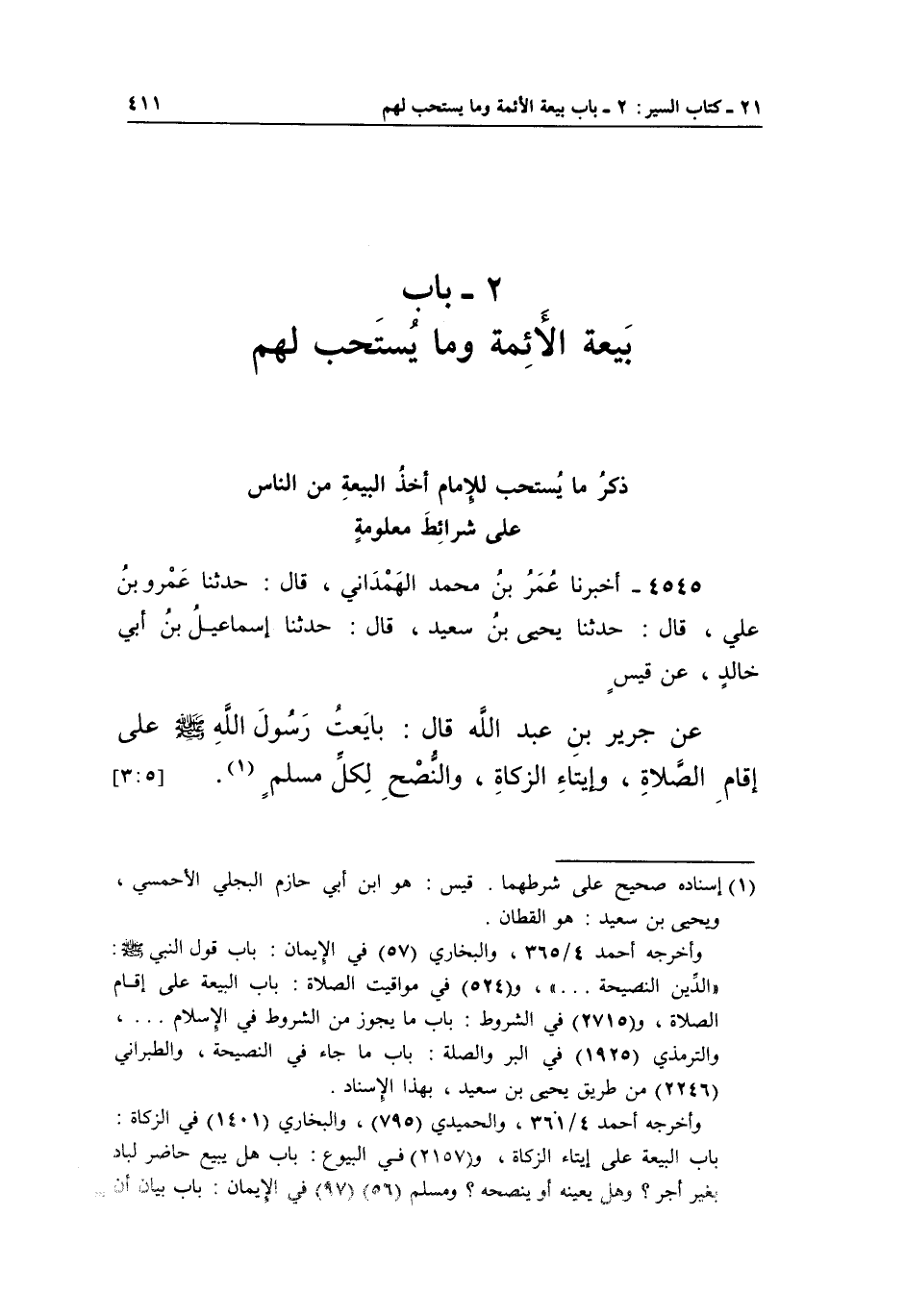 4545 - أَخْبَرَنَا عُمَرُ بْنُ مُحَمَّدٍ الْهَمْدَانِيُّ، قَالَ: حَدَّثَنَا عَمْرُو بْنُ عَلِيٍّ، قَالَ: حَدَّثَنَا يَحْيَى بْنُ سَعِيدٍ، قَالَ: حَدَّثَنَا إِسْمَاعِيلُ بْنُ أَبِي خَالِدٍ، عَنْ قَيْسٍ عَنْ جَرِيرِ بْنِ عَبْدِ اللَّهِ قَالَ: بَايَعَتْ رَسُولُ اللَّهِ صَلَّى اللَّهُ عَلَيْهِ وَسَلَّمَ عَلَى إِقَامِ الصَّلَاةِ، وإيتاء الزكاة، والنصح لكل مسلم1.