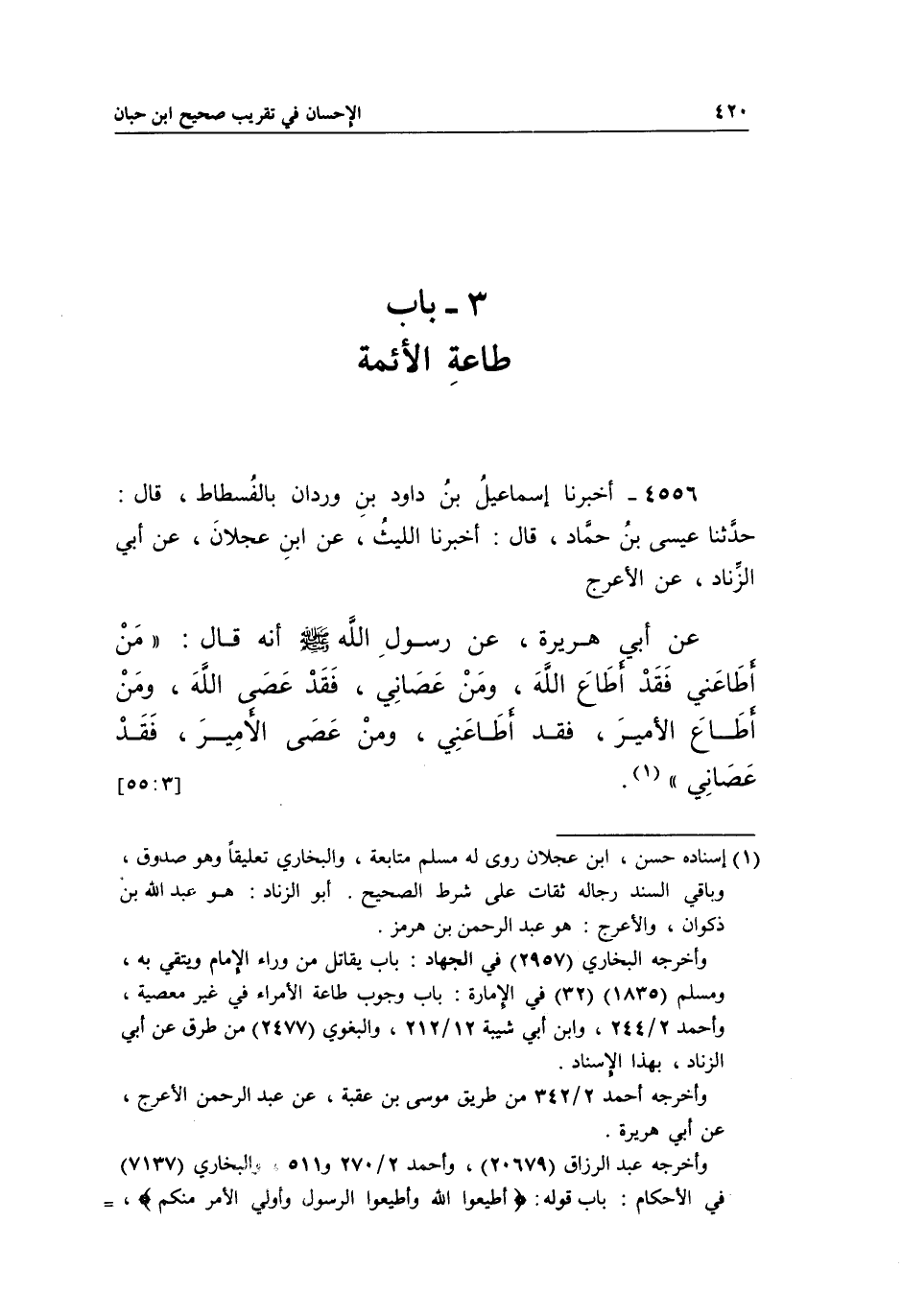 4556 - أَخْبَرَنَا إِسْمَاعِيلُ بْنُ دَاوُدَ بْنِ وَرْدَانَ بِالْفُسْطَاطِ، قَالَ: حَدَّثَنَا عِيسَى بْنُ حَمَّادٍ، قَالَ: أَخْبَرَنَا اللَّيْثُ، عَنِ ابْنِ عَجْلَانَ، عَنْ أَبِي الزِّنَادِ، عَنِ الْأَعْرَجِ عَنْ أَبِي هُرَيْرَةَ، عَنْ رَسُولِ اللَّهِ صَلَّى اللَّهُ عَلَيْهِ وَسَلَّمَ أَنَّهُ قَالَ: "مَنْ أَطَاعَنِي فَقَدْ أَطَاعَ اللَّهَ، وَمَنْ عَصَانِي، فَقَدْ عَصَى اللَّهَ، وَمَنْ أَطَاعَ الْأَمِيرَ، فَقَدْ أَطَاعَنِي، وَمَنْ عَصَى الْأَمِيرَ، فقد عصاني" 1.
