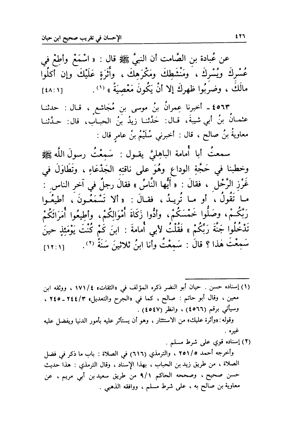 سَمِعْتُ أَبَا أُمَامَةَ الْبَاهِلِيَّ يَقُولُ: سَمِعْتُ رَسُولَ اللَّهِ صَلَّى اللَّهُ عَلَيْهِ وَسَلَّمَ وَخَطَبَنَا فِي حَجَّةِ الْوَدَاعِ وَهُوَ عَلَى نَاقَتِهِ الْجَدْعَاءِ، وَتَطَاوَلَ فِي غَرْزِ الرَّحْلِ، فَقَالَ: "أَيُّهَا النَّاسُ" فَقَالَ رَجُلٌ فِي آخِرِ النَّاسِ: مَا تَقُولُ، أَوْ مَا تُرِيدُ، فَقَالَ: "أَلَا تَسْمَعُونَ، أَطِيعُوا رَبَّكُمْ، وصلوا خمسكم، وأدوا زكاة أموالكم، وأطيعوا أمراءكم تَدْخُلُوا جُنَّةَ رَبِّكُمْ" فَقُلْتُ لِأَبِي أُمَامَةَ: ابْنَ كَمْ كُنْتَ يَوْمَئِذٍ حِينَ سَمِعْتَ هَذَا؟ قَالَ: سمعت وأنا ابن ثلاثين سنة2.