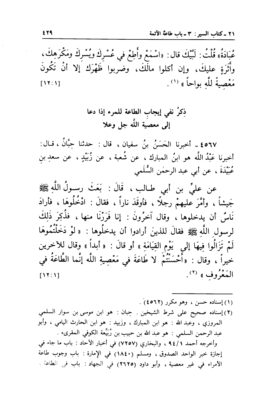 4567 - أَخْبَرَنَا الْحَسَنُ بْنُ سُفْيَانَ، قَالَ: حَدَّثَنَا حِبَّانُ، قَالَ: أَخْبَرَنَا عَبْدُ اللَّهِ هُوَ ابْنُ الْمُبَارَكِ، عَنْ شُعْبَةَ، عَنْ زُبَيْدٍ، عَنْ سَعْدِ بْنِ عُبَيْدَةَ، عَنْ أَبِي عَبْدِ الرَّحْمَنِ السُّلَمِيِّ عَنْ عَلِيِّ بْنِ أَبِي طَالِبٍ، قَالَ: بَعَثَ رَسُولُ اللَّهِ صَلَّى اللَّهُ عَلَيْهِ وَسَلَّمَ جَيْشًا، وَأَمَرَ عَلَيْهِمْ رَجُلًا، فَأَوْقَدَ نَارًا، فَقَالَ: ادْخُلُوهَا، فَأَرَادَ نَاسٌ أَنْ يَدْخُلُوهَا، وَقَالَ آخَرُونَ: إِنَّا فَرَرْنَا مِنْهَا، فَذُكِرَ ذَلِكَ لِرَسُولِ اللَّهِ صَلَّى اللَّهُ عَلَيْهِ وَسَلَّمَ فقَالَ لِلَّذِينَ أَرَادُوا أَنْ يَدْخُلُوهَا: "لَوْ دَخَلْتُمُوهَا لَمْ تَزَالُوا فِيهَا إِلَى يَوْمِ الْقِيَامَةِ" أَوْ قَالَ: "أَبَدًا" وَقَالَ لِلْآخَرِينَ خَيْرًا، وَقَالَ: "أَحْسَنْتُمْ لَا طَاعَةَ فِي مَعْصِيَةِ اللَّهِ إِنَّمَا الطَّاعَةُ في المعروف" 1.