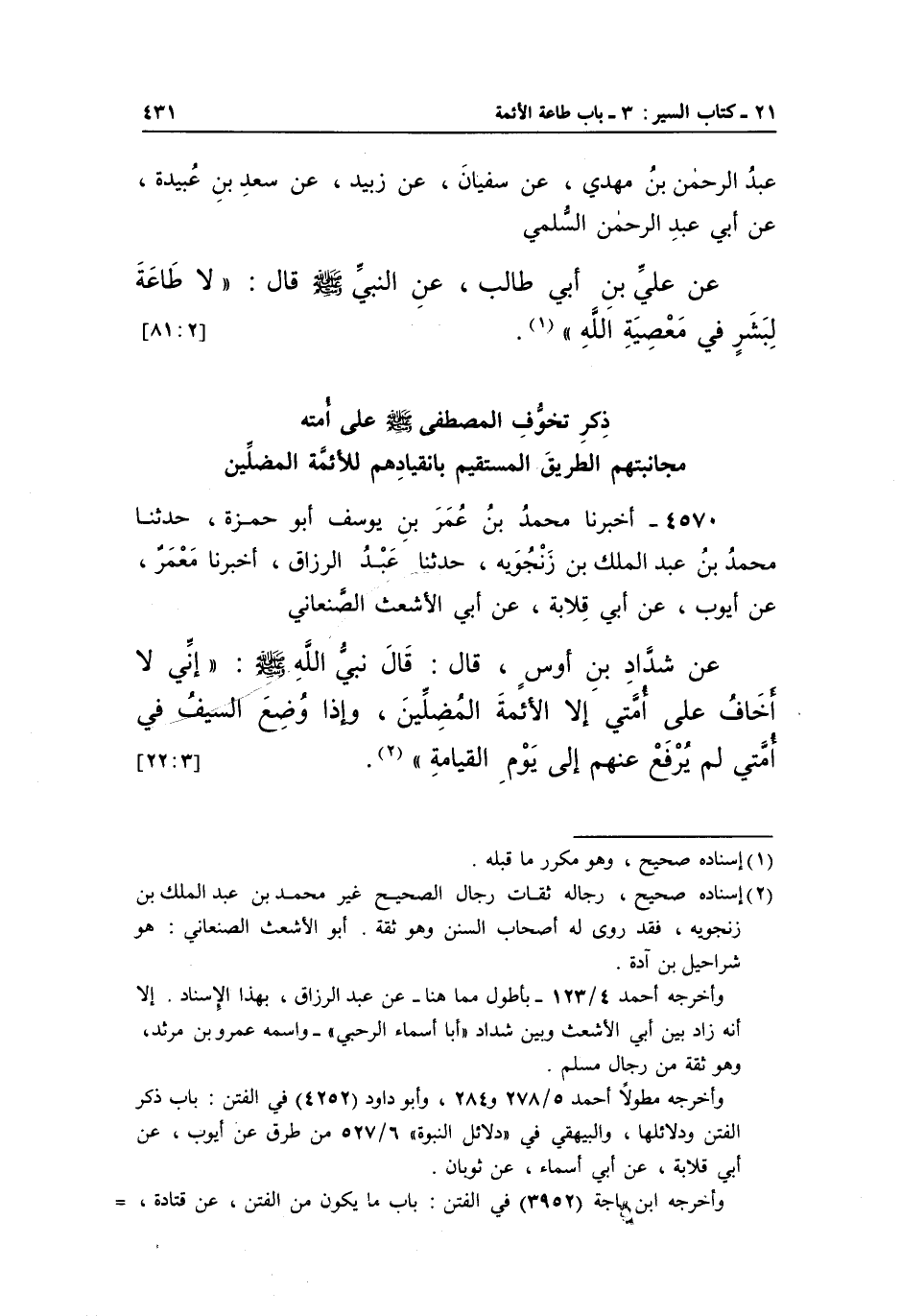 عَبْدُ الرَّحْمَنِ بْنُ مَهْدِيِّ، عَنْ سُفْيَانَ، عَنْ زُبَيْدٍ، عَنْ سَعْدِ بْنِ عُبَيْدَةَ، عَنْ أَبِي عَبْدِ الرَّحْمَنِ السُّلَمِيِّ عَنْ عَلِيِّ بْنِ أَبِي طَالِبٍ، عَنِ النَّبِيِّ صَلَّى اللَّهُ عَلَيْهِ وَسَلَّمَ قَالَ: "لَا طَاعَةَ لِبَشَرٍ فِي مَعْصِيَةِ اللَّهِ" 1.