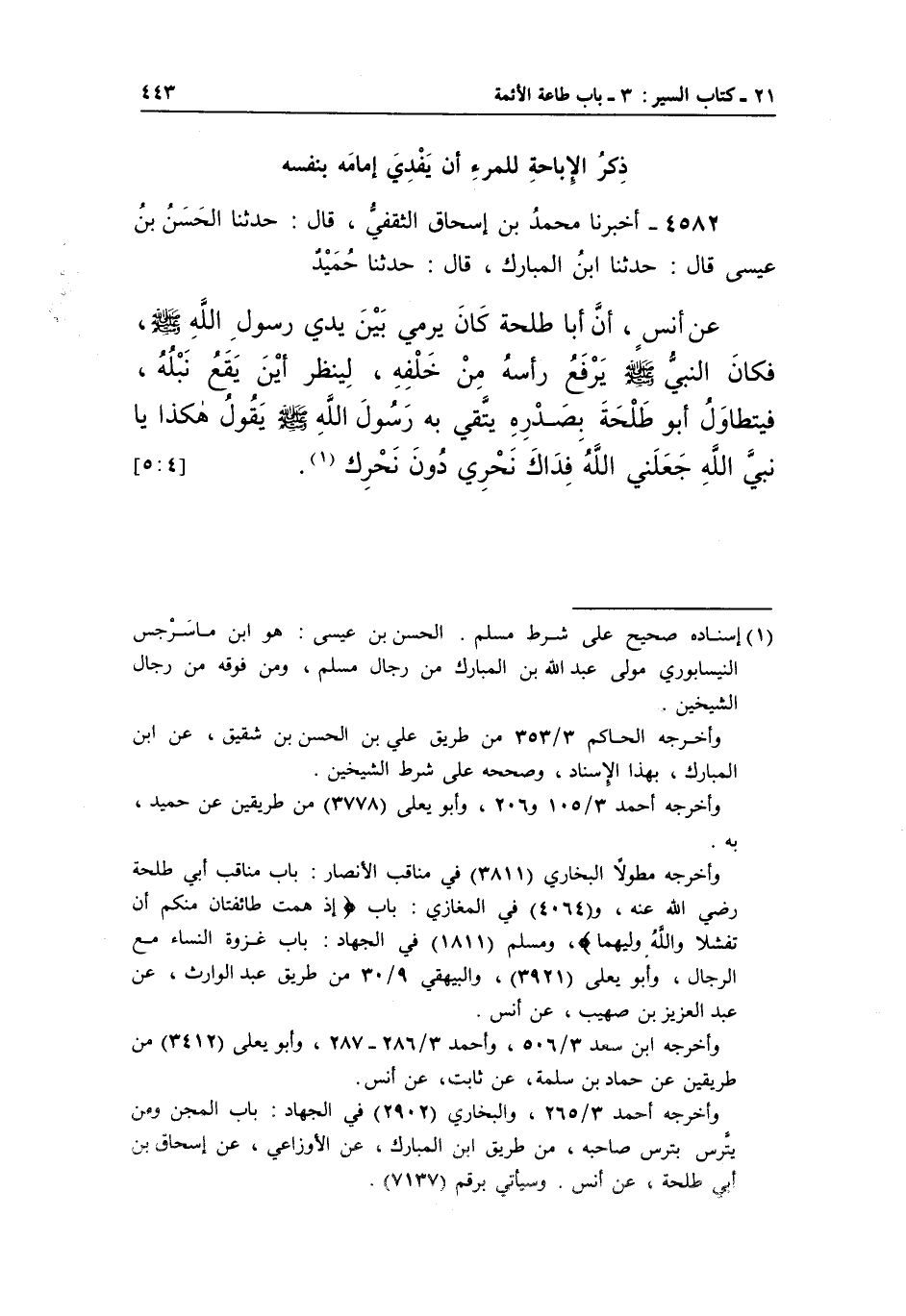 4582 - أَخْبَرَنَا مُحَمَّدُ بْنُ إِسْحَاقَ الثَّقَفِيُّ، قَالَ: حَدَّثَنَا الْحَسَنُ بْنُ عِيسَى قَالَ: حَدَّثَنَا ابْنُ الْمُبَارَكِ، قَالَ: حَدَّثَنَا حُمَيْدٌ عَنْ أَنَسٍ، أَنَّ أَبَا طَلْحَةَ كَانَ يَرْمِي بَيْنَ يَدَيْ رَسُولِ اللَّهِ صَلَّى اللَّهُ عَلَيْهِ وَسَلَّمَ، فَكَانَ النَّبِيُّ صَلَّى اللَّهُ عَلَيْهِ وَسَلَّمَ يَرْفَعُ رَأْسَهُ مِنْ خَلْفِهِ، لَيَنْظُرَ أَيْنَ يَقَعُ نَبْلُهُ، فَيَتَطَاوَلُ أَبُو طَلْحَةَ بِصَدْرِهِ يَتَّقِي بِهِ رَسُولُ اللَّهِ صَلَّى اللَّهُ عَلَيْهِ وَسَلَّمَ يَقُولُ هَكَذَا يَا نَبِيَّ اللَّهِ جَعَلَنِي اللَّهُ فِدَاكَ نحري دون نحرك1.