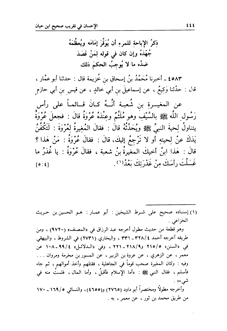 عَنِ الْمُغِيرَةِ بْنِ شُعْبَةَ أَنَّهُ كَانَ قَائِمًا عَلَى رَأْسَ رَسُولِ اللَّهِ صَلَّى اللَّهُ عَلَيْهِ وَسَلَّمَ بِالسَّيْفِ وَهُوَ مُلَثَّمٌ وَعِنْدَهُ عُرْوَةُ قَالَ: فَجَعَلَ عُرْوَةُ يَتَنَاوَلُ لِحْيَةَ النَّبِيِّ صَلَّى اللَّهُ عَلَيْهِ وَسَلَّمَ وَيُحَدِّثُهُ قَالَ: فَقَالَ الْمُغِيرَةُ لِعُرْوَةَ: لَتَكُفَّنَّ يَدَكَ عَنْ لِحْيَتِهِ أَوْ لَا تَرْجِعُ إِلَيْكَ، قَالَ: فَقَالَ عُرْوَةُ: مَنْ هَذَا؟ قال: هذا بن أَخِيكَ الْمُغِيرَةُ بْنُ شُعْبَةَ، فَقَالَ عُرْوَةُ: يَا غُدَرُ مَا غَسَلْتَ رَأْسَكَ مِنْ غَدْرَتِكَ بَعْدُ1.