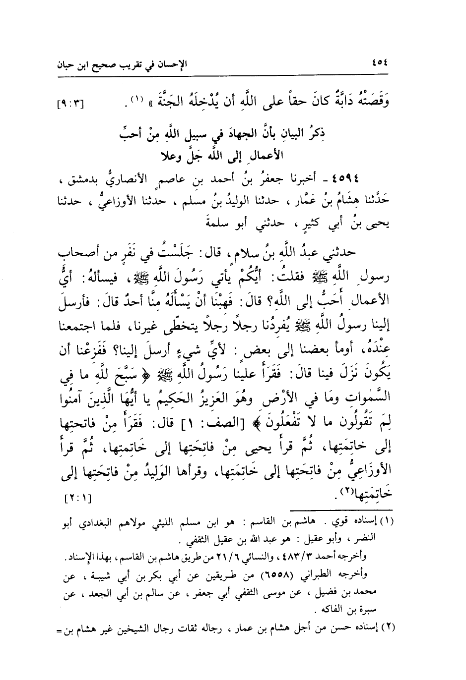 4594 - أَخْبَرَنَا جَعْفَرُ بْنُ أَحْمَدَ بْنِ عَاصِمٍ الْأَنْصَارِيُّ بِدِمَشْقَ، حَدَّثَنَا هِشَامُ بْنُ عَمَّارٍ، حَدَّثَنَا الْوَلِيدُ بْنُ مُسْلِمٍ، حَدَّثَنَا الْأَوْزَاعِيُّ، حَدَّثَنَا يَحْيَى بْنُ أَبِي كَثِيرٍ، حَدَّثَنِي أَبُو سَلَمَةَ حَدَّثَنِي عَبْدُ اللَّهِ بْنُ سَلَّامٍ، قَالَ: جَلَسْتُ فِي نَفَرٍ مِنْ أَصْحَابِ رَسُولِ اللَّهِ صَلَّى اللَّهُ عَلَيْهِ وَسَلَّمَ فَقُلْتُ: أَيُّكُمْ يَأْتِي رَسُولَ اللَّهِ صَلَّى اللَّهُ عَلَيْهِ وَسَلَّمَ، فَيَسْأَلَهُ: أَيُّ الْأَعْمَالِ أَحَبُّ إِلَى اللَّهِ؟ قَالَ: فَهِبْنَا أَنْ يَسْأَلَهُ مِنَّا أَحَدٌ قَالَ: فَأَرْسَلَ إِلَيْنَا رَسُولُ اللَّهِ صَلَّى اللَّهُ عَلَيْهِ وَسَلَّمَ يُفْرِدُنا رَجُلًا رَجُلًا يَتَخَطَّى غَيْرَنَا، فَلَمَّا اجْتَمَعْنَا عِنْدَهُ، أَوْمَأَ بَعْضُنَا إِلَى بَعْضٍ: لِأَيِّ شَيْءٍ أَرْسَلَ إِلَيْنَا؟ فَفَزِعْنَا أَنْ يَكُونَ نَزَلَ فِينَا قَالَ: فَقَرَأَ عَلَيْنَا رَسُولُ اللَّهِ صَلَّى اللَّهُ عَلَيْهِ وَسَلَّمَ {سَبَّحَ لِلَّهِ مَا فِي السَّمَاوَاتِ وَمَا فِي الْأَرْضِ وَهُوَ الْعَزِيزُ الْحَكِيمُ يَا أَيُّهَا الَّذِينَ آمَنُوا لِمَ تَقُولُونَ مَا لَا تَفْعَلُونَ} [الصف:2] قَالَ: فَقَرَأَ مِنْ فَاتِحَتِهَا إِلَى خَاتِمَتِهَا، ثُمَّ قَرَأَ يَحْيَى مِنْ فَاتِحَتِها إِلَى خَاتِمَتِهَا، ثُمَّ قَرَأَ الْأَوْزَاعِيُّ مِنْ فَاتِحَتِهَا إِلَى خَاتِمَتِهَا، وَقَرَأَهَا الوليد من فاتحتها إلى خاتمتها1.