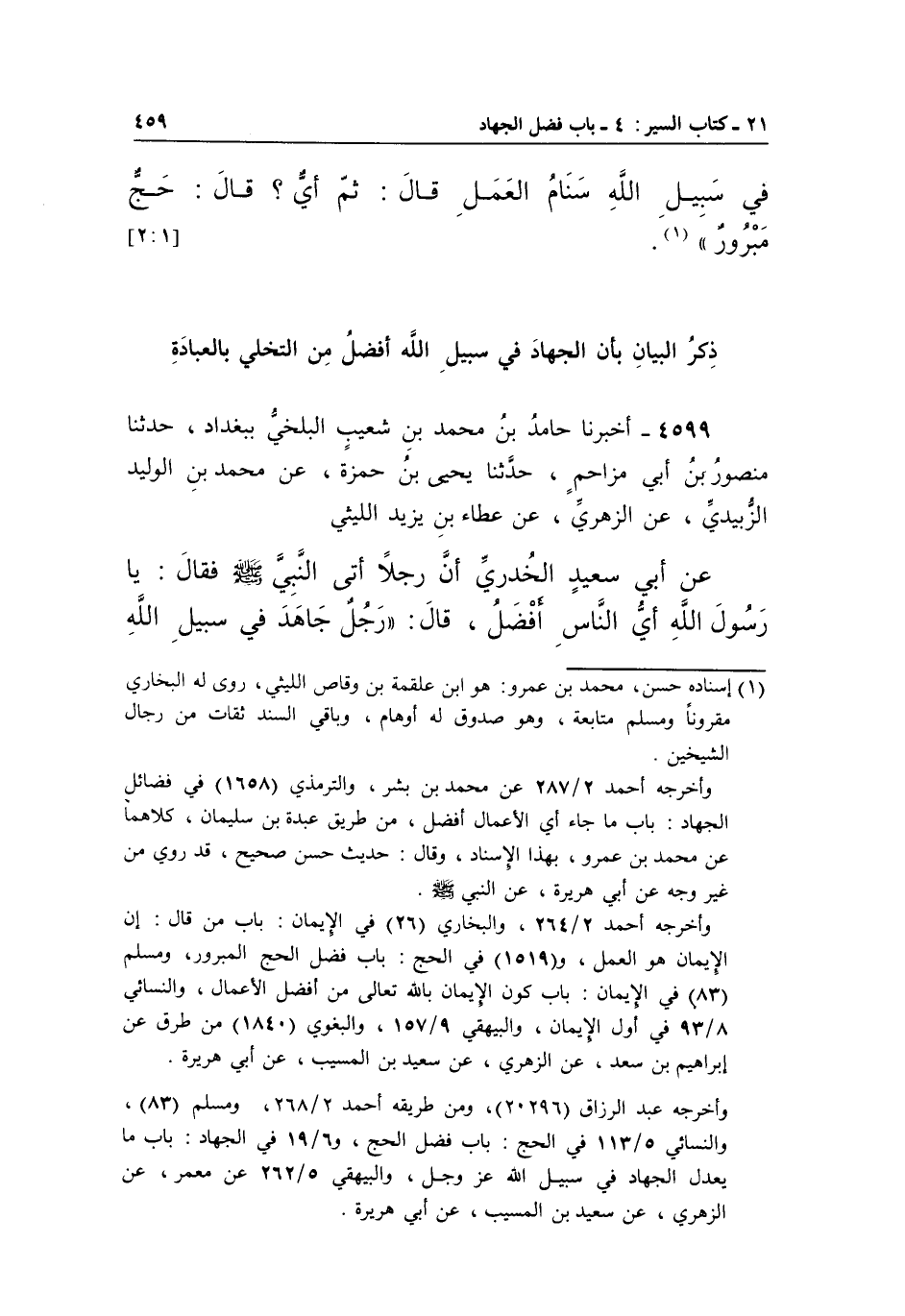 4599 - أَخْبَرَنَا حَامِدُ بْنُ مُحَمَّدِ بْنِ شُعَيْبٍ الْبَلْخِيُّ بِبَغْدَادَ، حَدَّثَنَا مَنْصُورُ بْنُ أَبِي مُزَاحِمٍ، حَدَّثَنَا يَحْيَى بْنُ حَمْزَةَ، عَنْ مُحَمَّدِ بْنِ الْوَلِيدِ الزُّبَيْدِيِّ، عَنِ الزُّهْرِيِّ، عَنْ عَطَاءِ بْنِ يَزِيدَ اللَّيْثِيِّ عَنْ أَبِي سَعِيدٍ الْخُدْرِيِّ أَنَّ رَجُلًا أَتَى النَّبِيَّ صَلَّى اللَّهُ عَلَيْهِ وَسَلَّمَ فَقَالَ: يَا رَسُولَ اللَّهِ أَيُّ النَّاسِ أَفْضَلُ، قَالَ: "رَجُلٌ جَاهَدَ فِي سَبِيلِ اللَّهِ