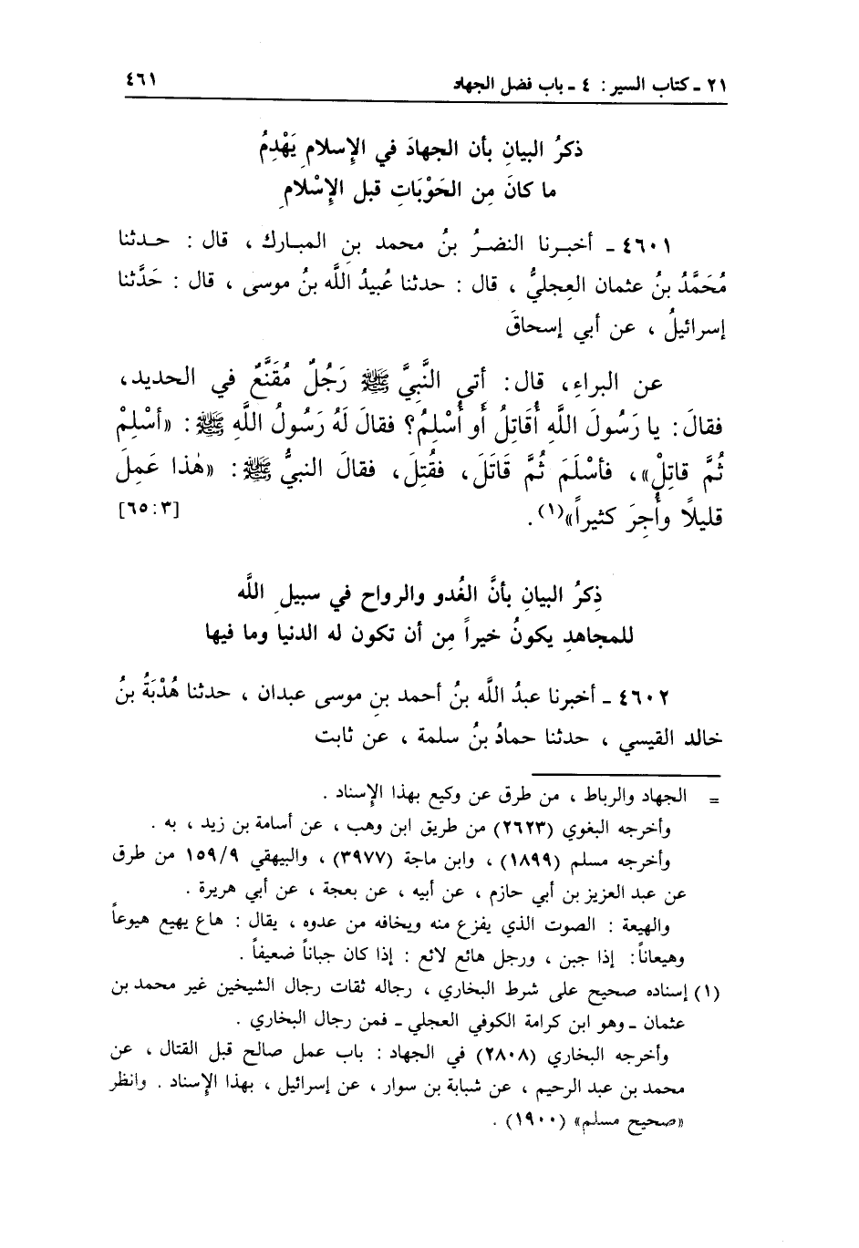 4601 - أَخْبَرَنَا النَّضْرُ بْنُ مُحَمَّدِ بْنِ الْمُبَارَكِ، قَالَ: حَدَّثَنَا مُحَمَّدُ بْنُ عُثْمَانَ الْعِجْلِيُّ، قَالَ: حَدَّثَنَا عُبَيْدُ اللَّهِ بْنُ مُوسَى، قَالَ: حَدَّثَنَا إِسْرَائِيلَ، عَنْ أَبِي إِسْحَاقَ عَنِ الْبَرَاءِ، قَالَ: أَتَى النَّبِيَّ صَلَّى اللَّهُ عَلَيْهِ وَسَلَّمَ رَجُلٌ مُقَنَّعٌ فِي الْحَدِيدِ، فَقَالَ: يَا رَسُولَ اللَّهِ أُقَاتِلُ أَوْ أَسْلَمَ؟ فَقَالَ لَهُ رَسُولُ اللَّهِ صَلَّى اللَّهُ عَلَيْهِ وَسَلَّمَ: "أَسْلِمْ ثُمَّ قَاتِلْ"، فَأَسْلَمَ ثُمَّ قَاتِلْ، فَقُتِلَ، فَقَالَ النَّبِيُّ صَلَّى اللَّهُ عَلَيْهِ وَسَلَّمَ: "هَذَا عمل قليلا وأجر كثيرا"1.