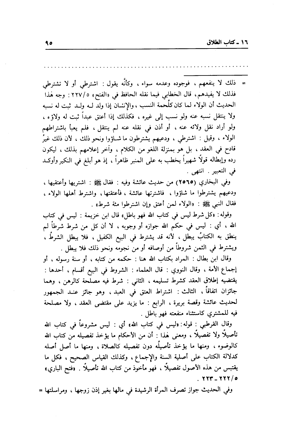 وقوله: "كل شرط ليس في كتاب الله فهو باطل" قال ابن خزيمة: ليس في كتاب الله، أي: ليس في حكم الله جوازه أو وجوبه، لا أن كل من شرط شرطاً لم ينطق به الكتابُ يبطل، لأنه قد يشترط في البيع الكفيل، فلا يبطلُ الشرطُ، ويشترط في الثمن شروطاً من أوصافه أو من نجومه ونحو ذلك فلا يبطل.