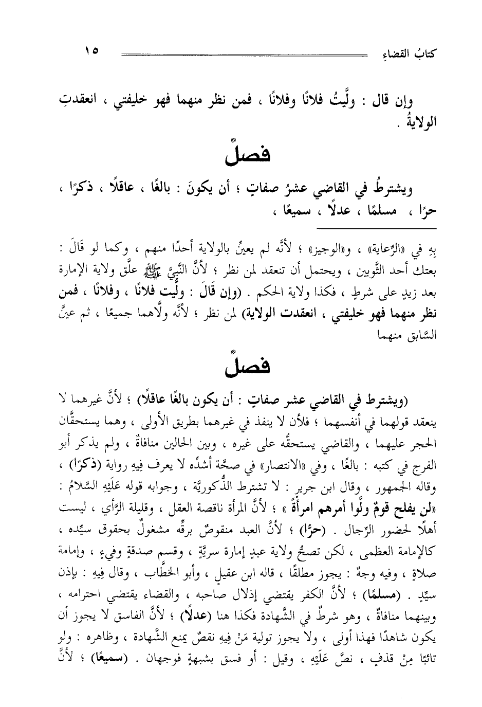 "ويشترط في القاضي عشر صفات أن يكون بالغا عاقلا" لأن غيرهما لا ينعقد قولهما في أنفسهما فلأن لا ينفذ في غيرهما بطريق الأولى وهما يستحقان الحجر عليهما والقاضي يستحقه على غيره وبين الحالين منافاة ولم يذكر أبو الفرج في كتبه بالغا وفي الانتصار في صحة أشده لا يعرف فيه رواية "ذكرا" وقاله الجمهور وقال ابن جرير لا تشترط الذكورية وجوابه: قوله عليه السلام: "لن يفلح قوم ولوا أمرهم امرأة" لأن المرأة ناقصة العقل وقليلة الرأي ليست أهلا لحضور الرجال "حرا" لأن العبد منقوص برقه مشغول بحقوق سيده كالإمامة العظمى لكن تصح ولاية عبد إمارة سرية وقسم صدقة وفيء وإمامة صلاة وفيه وجه يجوز مطلقا قاله ابن عقيل: وأبو الخطاب وقال فيه بإذن سيد "مسلما" لأن الكفر يقتضي إذلال صاحبه والقضاء يقتضي احترامه وبينهما منافاة وهو شرط في الشهادة فكذا هنا "عدلا" لأن الفاسق لا يجوز أن يكون شاهدا فهذا أولى ولا يجوز تولية من فيه نقص يمنع الشهادة وظاهره ولو تائبا من قذف نص عليه وقيل: أو فسق لشبهة فوجهان "سميعا" لأن
