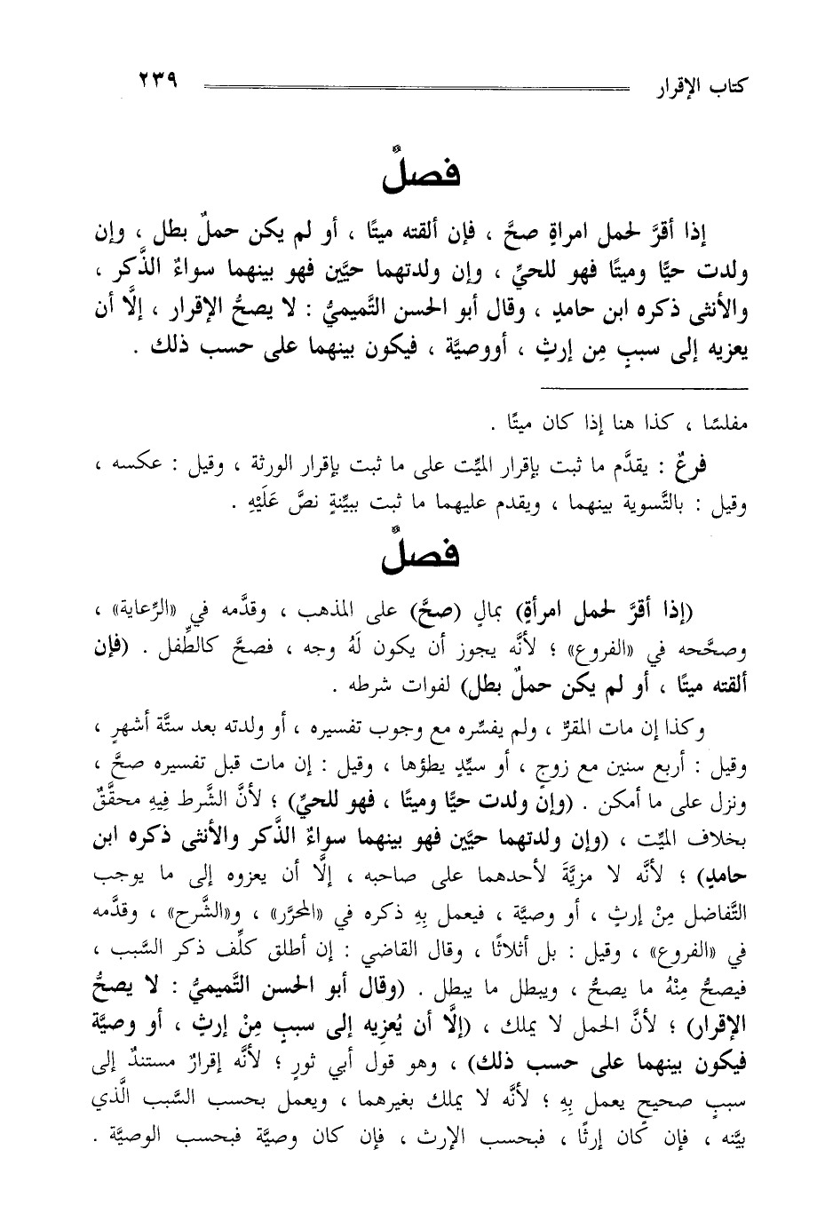 إذا اقر لحمل امرأة صح فإن ألقته ميتا أو لم يكن حمل بطل وإن ولدت حيا وميتا فهو للحي وإن ولدتهما حيين فهو بينهما سواء الذكر والأنثى ذكره ابن حامد وقال أبو الحسن التميمي لا يصح الإقرار إلا أن يعزيه إلى سبب من إرث أو وصية فيكون بينهما على حسب ذلك.