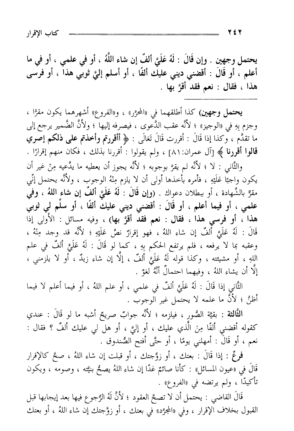 والثاني: لا لأنه لم يقر بوجوبه لأنه يجوز أن يعطيه ما يدعيه من غير أن يكون واجبا عليه فأمره بأخذها أولى أن لا يلزم منه الوجوب ولأنه يحتمل أني مقر بالشهادة أو ببطلان دعواك "وإن قال: له علي ألف إن شاء الله وفي علمي أو فيما أعلم أو قال اقضني ديني عليك ألفا أو سلم لي ثوبي هذا أو فرسي هذا فقال نعم فقد أقر بها" وفيه مسائل: الأولى إذا قال: له علي ألف إن شاء الله فهو إقرار نص عليه لأنه قد وجد منه وعقبه بما لا يرفعه فلم يرتفع الحكم به كما لو قال له علي ألف في علم الله أو مشيئته وكذا قوله له علي ألف إلا إن شاء زيد أو لا يلزمني إلا أن يشاء الله وفيهما احتمال أنه لغو.