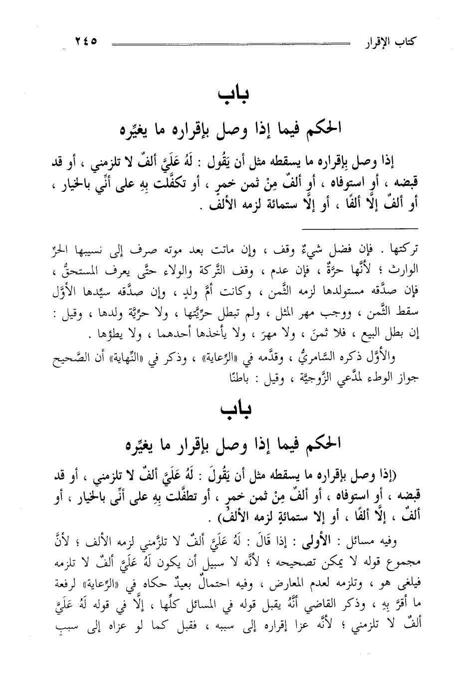 "إذا وصل إقراره ما يسقطه مثل أن يقول له علي ألف لا تلزمني أو قد قبضه أو استوفاه أو ألف من ثمن خمر أو تكفلت به على أني بالخيار أو ألف إلا ألفا أو إلا ستمائة لزمه الألف" وفيه مسائل: الأولى: إذا قال له علي ألف لا تلزمني لزمه الألف لأن مجموع قوله لا يمكن تصحيحه لأنه لا سبيل أن يكون له علي ألف لا تلزمه فيلغى هو وتلزمه لعدم المعارض وفيه احتمال بعيد حكاه في الرعاية لرفعة ما أقر به وذكر القاضي أنه يقبل قوله في المسائل كلها إلا في قوله له علي ألف لا تلزمني لأنه عزا إقراره إلى سببه فقبل كما لو عزاه إلى سبب