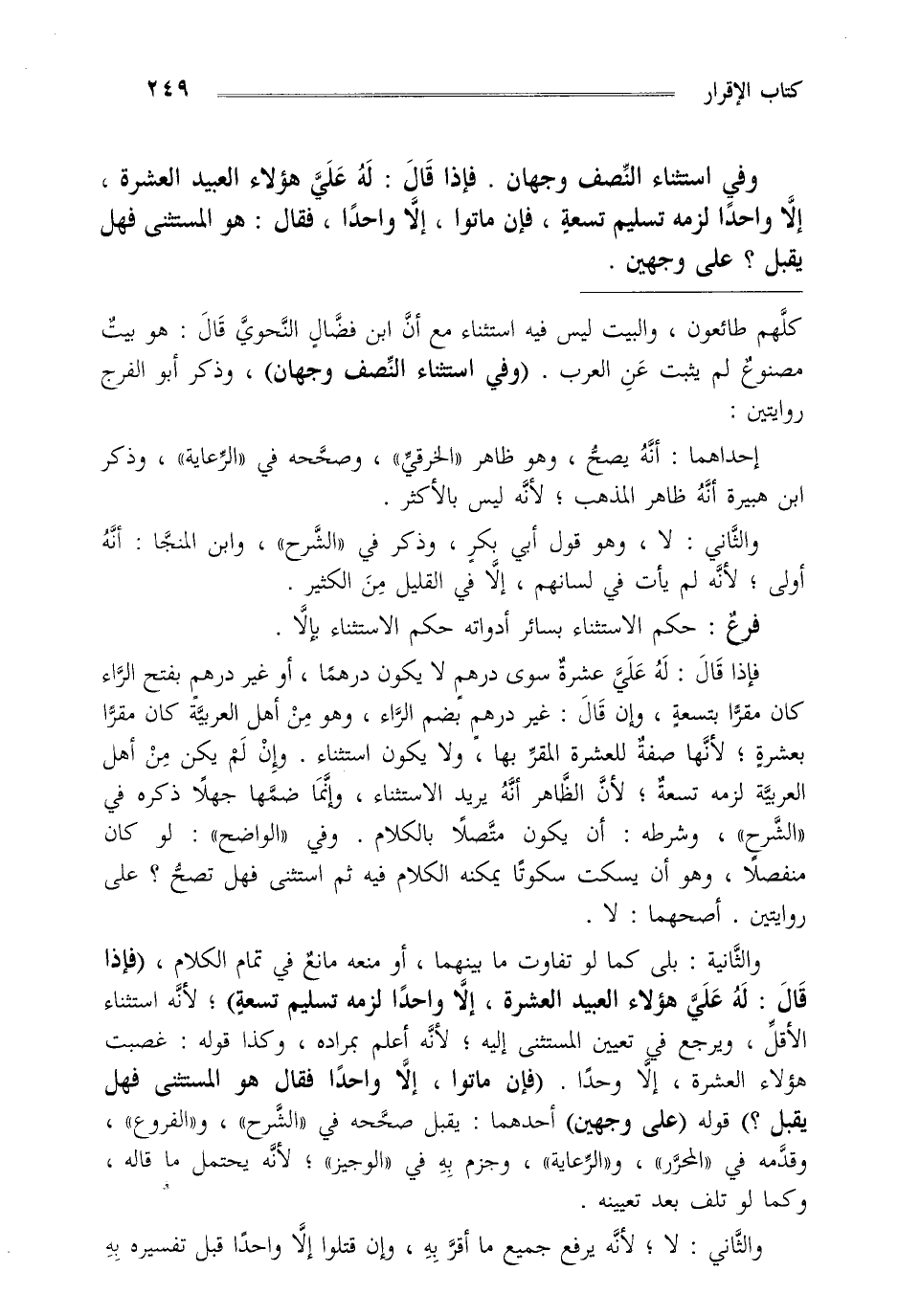 و الثانية: بلى كما لو تفاوت ما بينهما أو منعه مانع في تمام الكلام "فإذا قال: له علي هؤلاء العبيد العشرة إلا واحدا لزمه تسليم تسعة" لأنه استثناء الأقل ويرجع في تعيين المستثنى إليه لأنه أعلم بمراده وكذا قوله غصبت هؤلاء العشرة إلا واحدا "فإن ماتوا إلا واحدا فقال هو المستثنى فهل يقبل" قوله "على وجهين" أحدهما: يقبل صححه في الشرح والفروع وقدمه في المحرر والرعاية وجزم به في الوجيز لأنه يحتمل ما قاله وكما لو تلف بعد تعيينه.