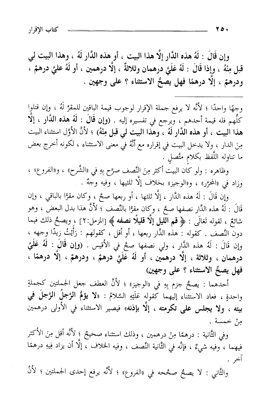 وإن قال له هذه الدار إلا ثلثها أو ربعها صح وكان مقرا بالباقي وإن قال: له هذه الدار نصفها صح وكان مقرا بالنصف لأن هذا بدل البعض وهو شائع لقوله تعالى :{قُمِ اللَّيْلَ إِلَّا قَلِيلاً نِصْفَهُ} [المزمل:2]، ويصح ذلك فيما دون النصف كقوله هذه الدار ربعها أو أقل كقولهم رأيت زيدا وجهه وإن قال له هذه الدار ولي نصفها صح في الأقيس "وإن قال له علي درهمان وثلاثة إلا درهمين أو له علي درهم ودرهم إلا درهما فهل يصح الاستثناء؟ على وجهين".