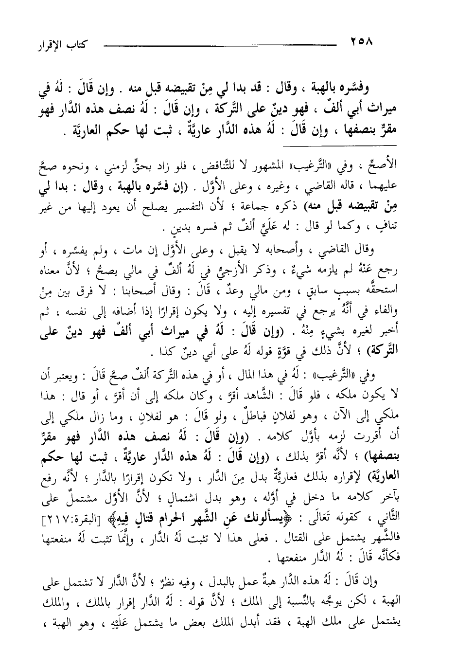 وفسره بالهبة وقال: قد بدا لي من تقبيضه قبل منه وإن قال: له في ميراث أبي ألف فهو دين على التركة وإن قال: له نصف هذه الدار فهو مقر بنصفها وإن قال: له هذه الدار عارية ثبت لها حكم العارية.