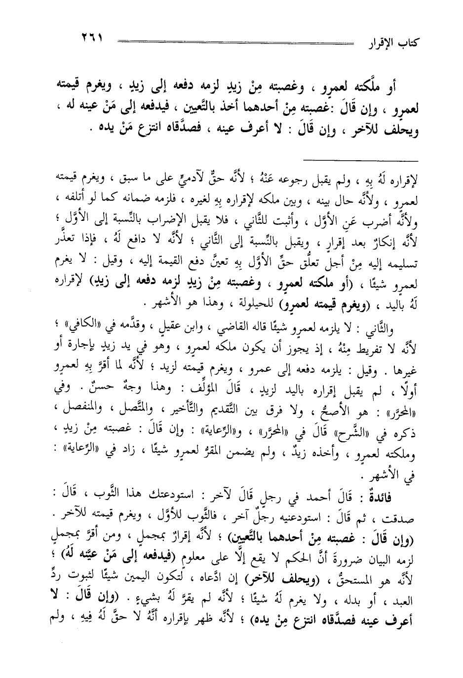والثاني: لا يلزمه لعمرو شيئا قاله القاضي وابن عقيل: وقدمه في الكافي لأنه لا تفريط منه إذ يجوز أن يكون ملكه لعمرو وهو في يد زيد بإجارة أو غيرها وقيل: يلزمه دفعه إلى عمرو ويغرم قيمته لزيد لأنه لما أقر به لعمرو أولا لم يقبل إقراره باليد لزيد قال المؤلف وهذا وجه حسن وفي المحرر هو الأصح ولا فرق بين التقديم والتأخير والمتصل والمنفصل ذكره في الشرح قال في المحرر والرعاية وإن قال غصبته من زيد وملكته لعمرو وأخذه زيد ولم يضمن المقر لعمرو شيئا زاد في الرعاية في الأشهر.