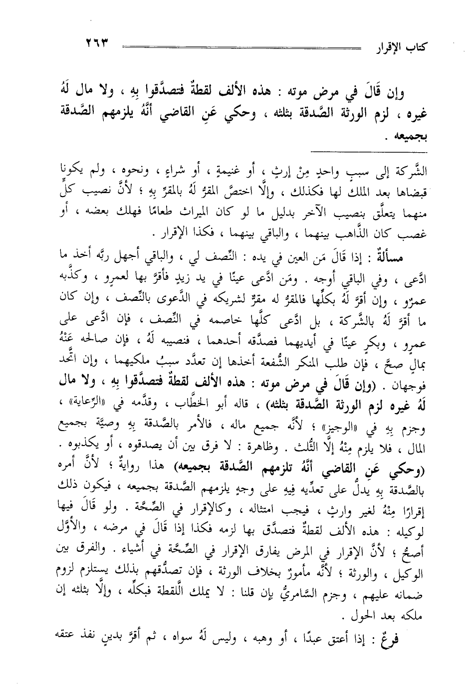 مسألة: إذا قال من العين في يده النصف لي والباقي أجهل ربه أخذ ما ادعى وفي الباقي أوجه ومن ادعى عينا في يد زيد فأقر بها لعمرو وكذبه عمرو وإن أقر له بكلها فالمقر له مقر لشريكه في الدعوى بالنصف وإن كان ما أقر له بالشركة بل ادعى كلها خاصمه في النصف فإن ادعى على عمرو وبكر عينا في أيديهما فصدقه أحدهما فنصيبه له فإن صالحه عنه بمال صح فإن طلب المنكر الشفعة أخذها إن تعدد سبب ملكيهما وإن اتحد فوجهان "وإن قال في مرض موته هذه الألف لقطة فتصدقوا به ولا مال له غيره لزم الورثة الصدقة بثلثه" قاله أبو الخطاب وقدمه في الرعاية وجزم به في الوجيز لأنه جميع ماله فالأمر بالصدقة به وصية بجميع المال فلا يلزم منه إلا الثلث وظاهره لا فرق بين أن يصدقوا أو يكذبوه "وحكي عن القاضي أنه تلزمهم الصدقة بجميعه" هذا رواية لأن أمره بالصدقة به يدل على تعديه فيه على وجه يلزمهم الصدقة بجميعه فيكون ذلك إقرارا منه لغير وارث فيجب امتثاله وكالإقرار في الصحة ولو قال فيها لوكيله هذه الألف لقطة فتصدق بها لزمه فكذا إذا قال في مرضه والأول: أصح لأن الإقرار في المرض يفارق الإقرار في الصحة في أشياء