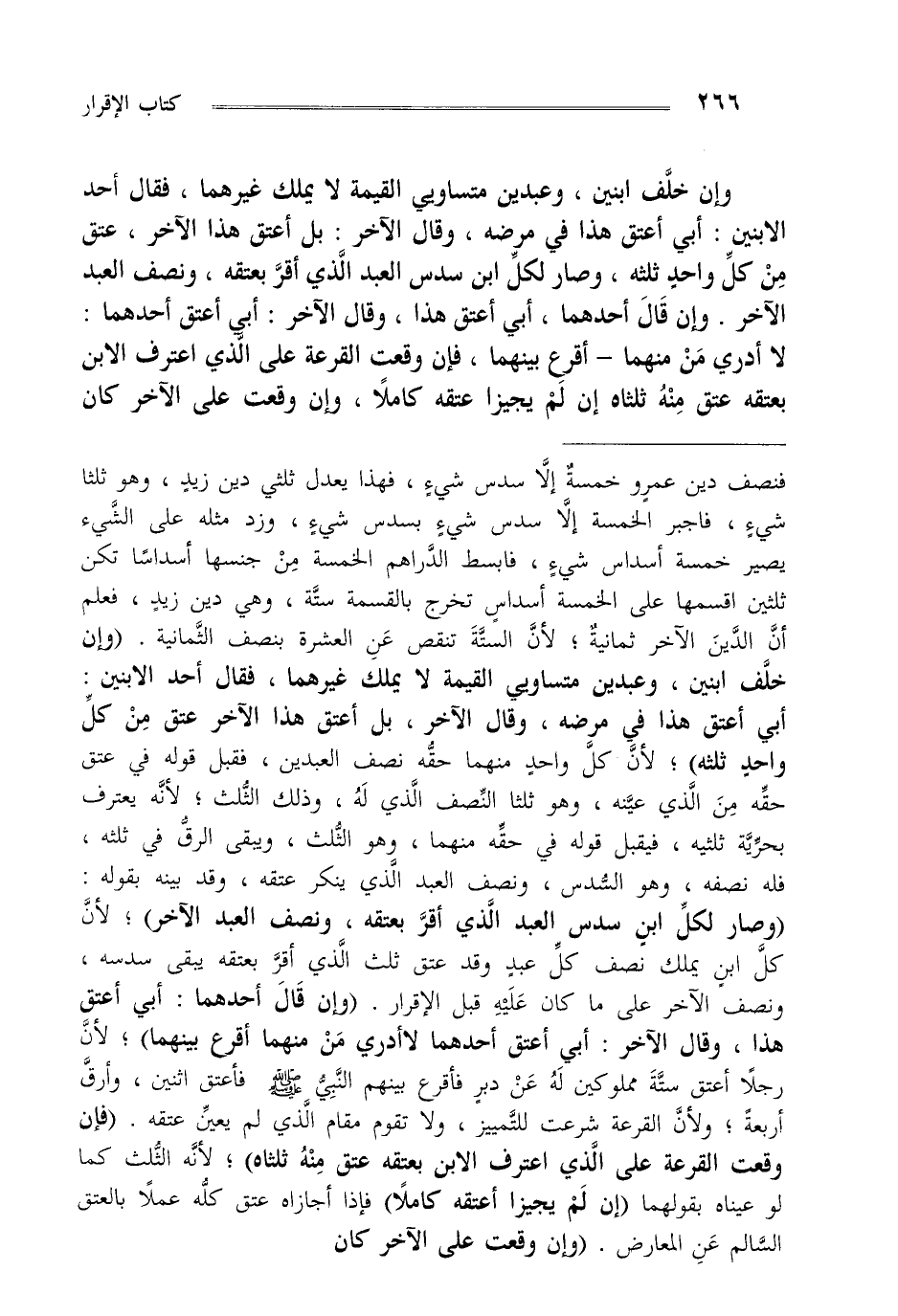 فنصف دين عمرو خمسة إلا سدس شي فهذا يعدل ثلثي دين زيد وهو ثلثا شيء فاجبر الخمسة إلا سدس شيء بسدس شيء وزد مثله على الشيء يصير خمسة أسداس شيء فابسط الدراهم الخمسة من جنسها أسداسا تكن ثلثين اقسمها على الخمسة أسداس تخرج بالقسمة ستة وهي دين زيد فعلم أن الدين الآخر ثمانية لأن الستة تنقص عن العشرة بنصف الثمانية "وإن خلف ابنين وعبدين متساويي القيمة لا يملك غيرهما فقال أحد الابنين أبي أعتق هذا في مرضه وقال الآخر بل أعتق هذا الآخر عتق من كل واحد ثلثه" لأن كل واحد منهما حقه نصف العبدين فقبل قوله في عتق حقه من الذي عينه وهو ثلثا النصف الذي له وذلك الثلث لأنه يعترف بحرية ثلثيه فيقبل قوله في حقه منهما وهو الثلث ويبقى الرق في ثلثه فله نصفه وهو السدس ونصف العبد الذي ينكر عتقه وقد بينه بقوله: "وصار لكل ابن سدس العبد الذي أقر بعتقه ونصف العبد الآخر" لأن كل ابن يملك نصف كل عبد وقد عتق ثلث الذي أقر بعتقه يبقى سدسه ونصف الآخر على ما كان عليه قبل الإقرار "وإن قال: أحدهما أبي أعتق هذا وقال الآخر أبي أعتق أحدهما لا أدري من منهما أقرع بينهما" لأن رجلا أعتق ستة مملوكين له عن دبر فأقرع بينهم النبي صلى الله عليه وسلم اثنين وارق أربعة شرعت للتمييز ولا تقوم مقام الذي لم يعين عتقه "فإن وقعت القرعة على الذي اعترف الابن بعتقه عتق منه ثلثاه" لأنه الثلث كما لو عيناه بقولهما "إن لم يجيزا أعتقه كاملا" فإذا أجازاه عتق كله عملا بالعتق السالم عن المعارض "وإن وقعت على الآخر كان