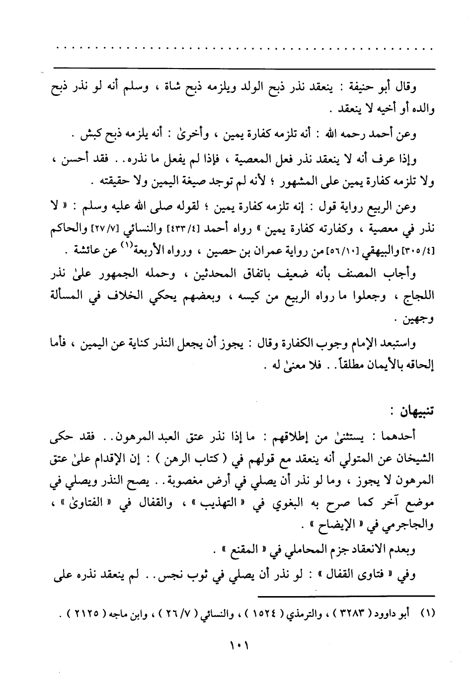 وعن الربيع رواية قول: إنه تلزمه كفارة يمين؛ لقوله صلى الله عليه وسلم: (لا نذر في معصية، وكفارته كفارة يمين) رواه أحمد [4/ 433] والنسائي [7/ 27] والحاكم [4/ 305] والبيهقي [10/ 56] من رواية عمران بن حصين، ورواه الأربعة عن عائشة.
