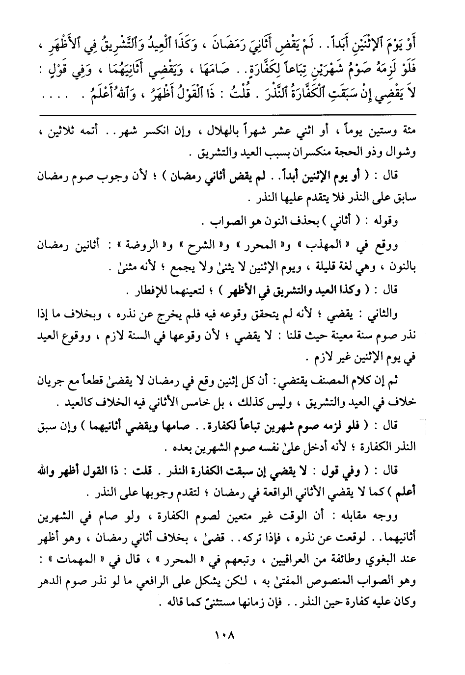 أوْ يَوْمَ الإثْنَيْنِ أَبَدًا .. لَمْ يَقْضِ أَثَانِيَ رَمَضَانَ، وَكَذَا العِيدُ وَالتَّشْرِيقُ فِي الأَظْهَرِ، فَلَوْ لَزِمَهُ صَوْمُ شَهْرَيْنِ تِبَاعًا لِكَفَّارَةٍ .. صَامَهَا، وَيَقْضِي أَثَانِيَهُمَا، وَفِي قَوْلٍ: لاَ يَقْضِي إِنْ سَبَقَتِ الْكَفَّارَةُ النَّذْرَ. قُلْتُ: ذَا الْقَوْلُ أَظْهَرُ، وَاللهُ أَعْلَمُ