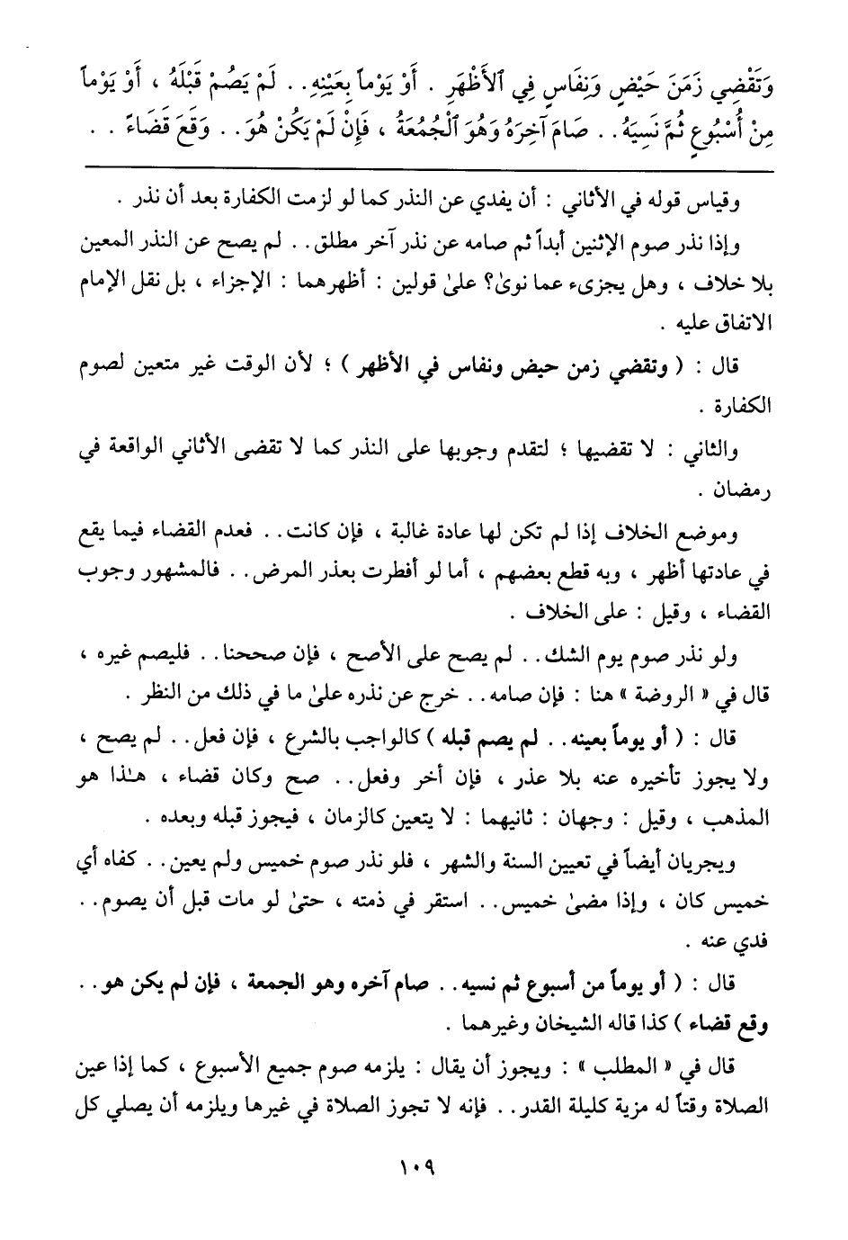 وَتَقْضِي زَمَنَ حَيْضٍ وَنِفَاسٍ فِي الأَظْهَرٍ. أَوْ يَوْمًا بِعَيْنِهِ .. لَمْ يَصُمْ قَبْلَهُ، أَوْ يَوْمًا مِنْ أُسْبُوعٍ ثُمَّ نَسِيَهُ .. صَامَ آخِرَهُ وَهُوَ الْجُمُعَةُ، فَإِنْ لَمْ يَكُنْ هُوَ .. وَقَعَ قَضَاءً