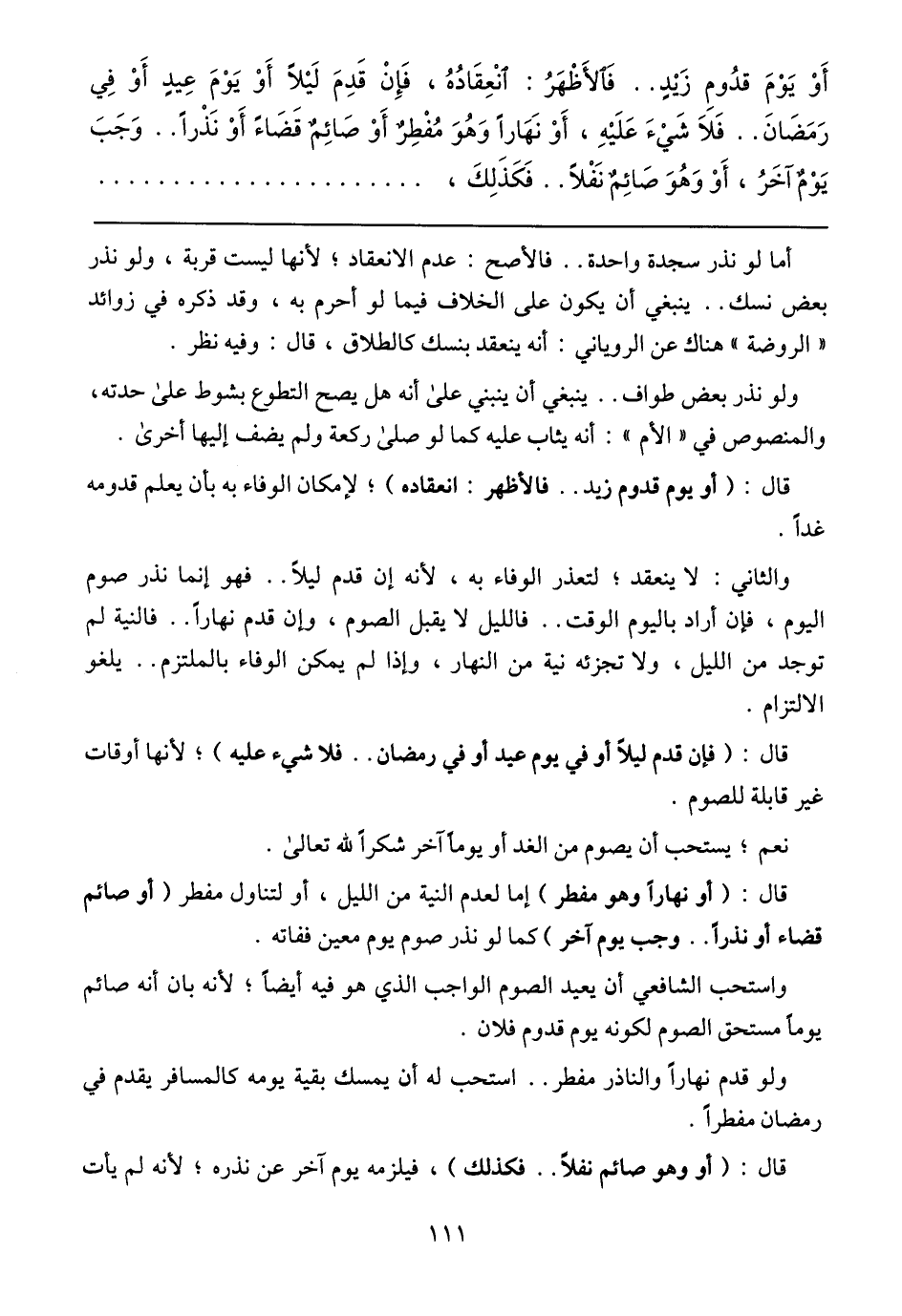 أوْ يَوْمَ قدُومِ زَيْدٍ .. فَالأَظْهَرُ: انْعِقَادُهُ، فَإِنْ قَدِمَ لَيْلًا أَوْ يَوْمَ عِيدٍ أَوْ فِي رَمَضَانَ .. فَلاَ شَيْءَ عَلَيْهِ، أَوْ نَهَارًا وَهُوَ مُفْطِرٌ أَوْ صَائِمٌ قَضَاءً أَوْ نَذْرًا .. وَجَبَ يَوْمٌ آخَرُ، أَوْ وَهُوَ صَائِمٌ نَفْلًا .. فَكَذَلِكَ،