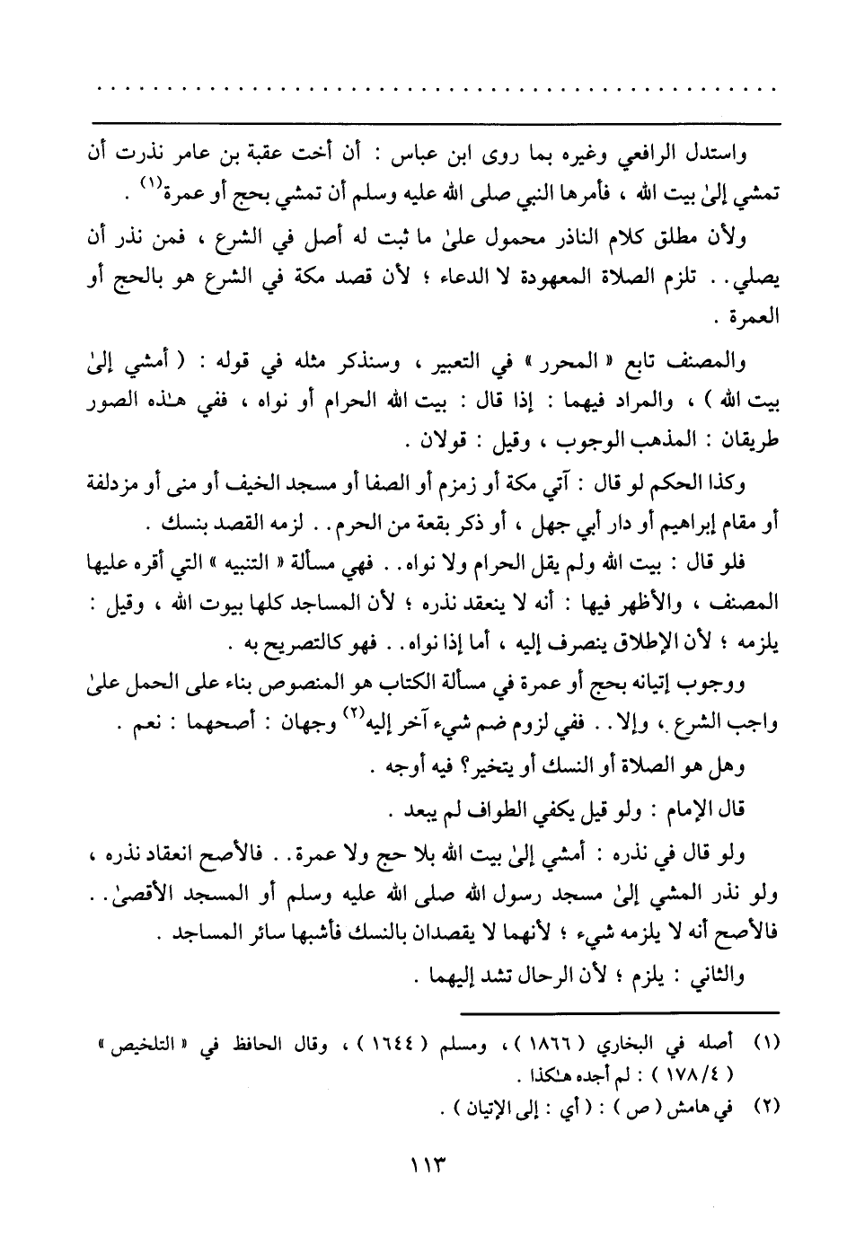 واستدل الرافعي وغيره بما روى ابن عباس: أن أخت عقبة بن عامر نذرت أن تمشي إلى بيت الله، فأمرها النبي صلى الله عليه وسلم أن تمشي بحج أو عمرة.