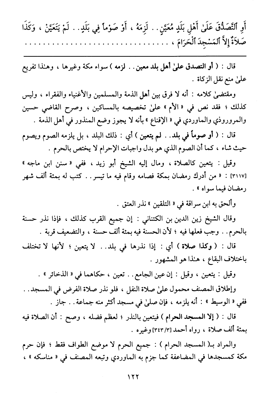 أَوِ التَّصَدُّقَ عَلَى أَهْلِ بَلَدٍ مُعَيَّنٍ .. لَزِمَهُ، أَوْ صَوْمًا فِي بَلَدٍ .. لَمْ يَتَعَيَّنْ، وَكَذَا صَلاَةٌ إِلاَّ المَسْجِدَ الْحَرَامَ،