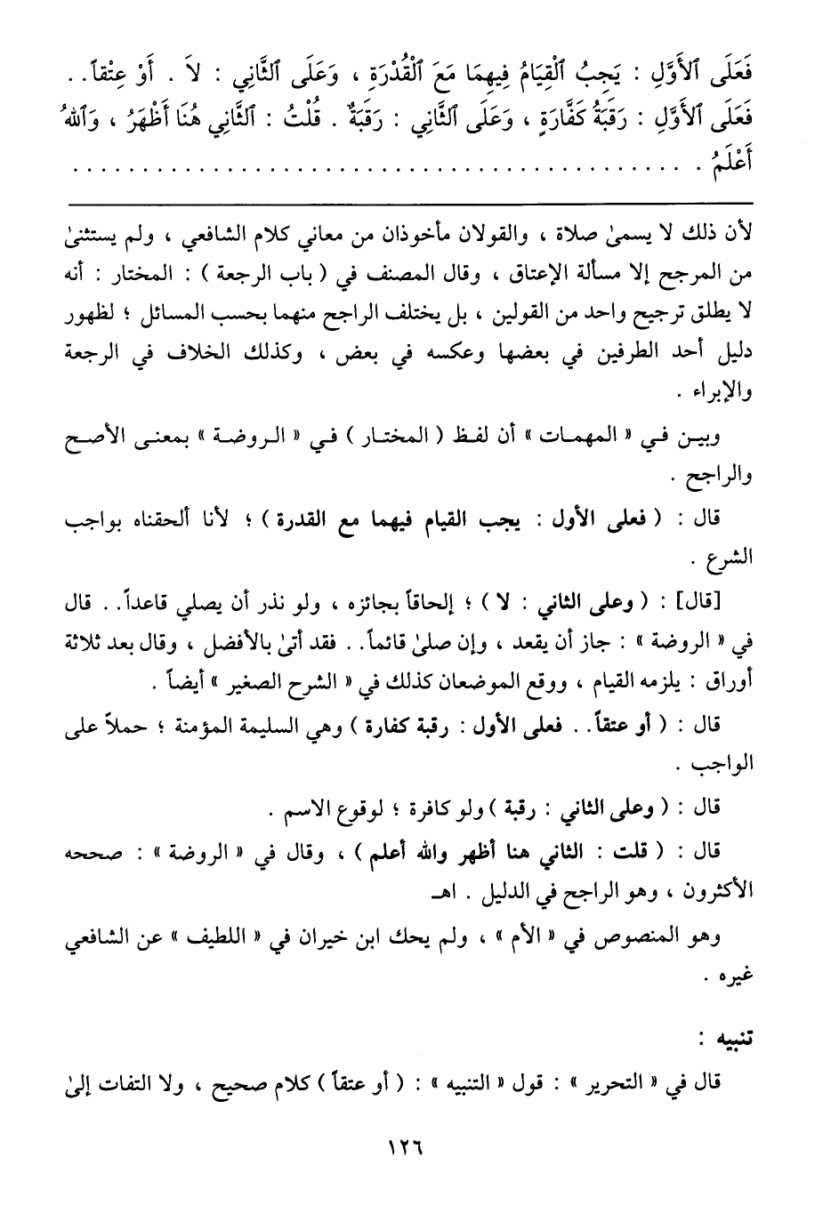 لأن ذلك لا يسمى صلاة، والقولان مأخوذان من معاني كلام الشافعي، ولم يستثنى من المرجح إلا مسالة الإعتاق، وقال المصنف (باب الرجعة): المختار: أنه لا يطلق ترجيح واحد من القولين، بل يختلف الراجح منهما بحسب المسائل؛ لظهور دليل أحد الطرفين بعض بعضها وعكسه في بعض، وكذلك الخلاف في الرجعة والإبراء.
