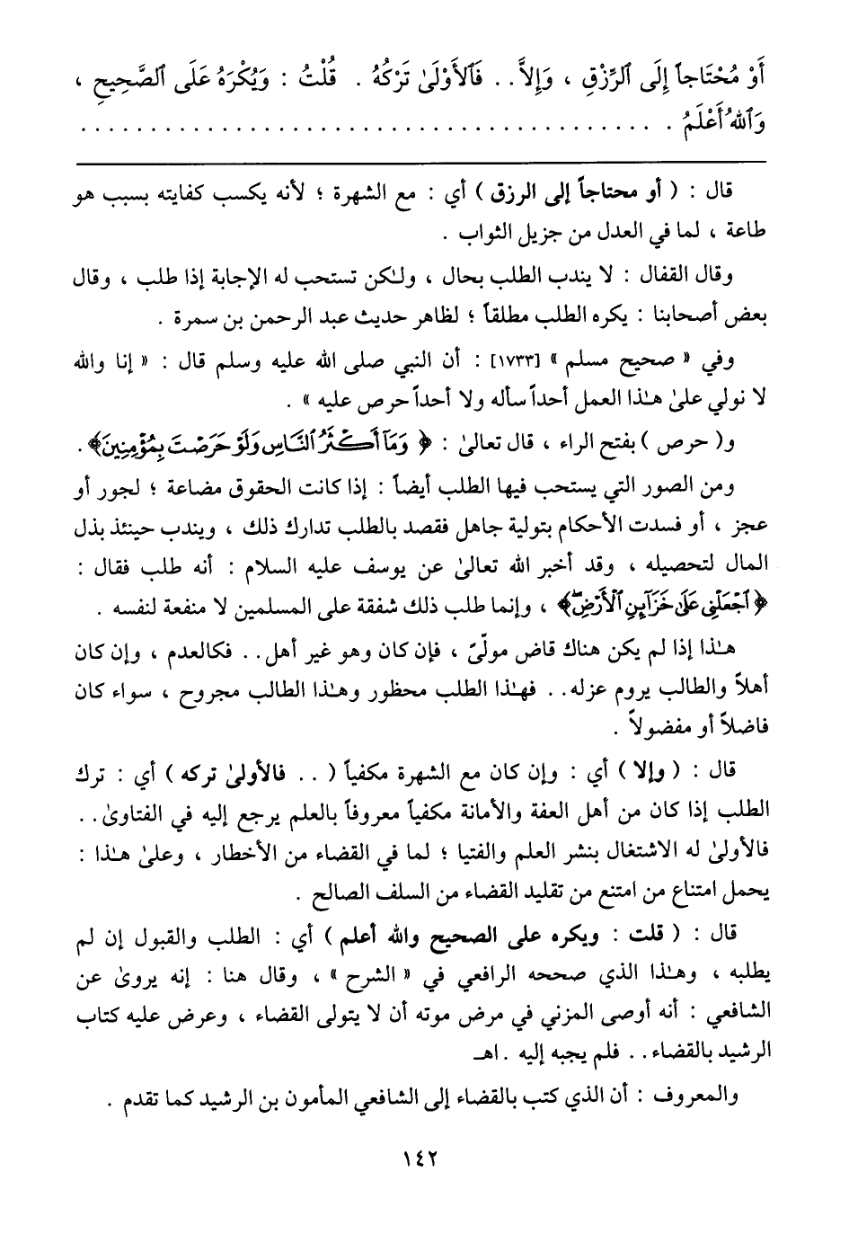 قال: (قلت: ويكره على الصحيح والله أعلم) أي: الطلب والقبول إن لم يطلبه، وهذا الذي صححه الرافعي في (الشرح)، وقال هنا: إنه يروى عن الشافعي: أنه أوصى المزني في مرض موته أن لا يتولى القضاء، وعرض عليه كتاب الرشيد بالقضاء .. فلم يجبه إليه. اهـ.