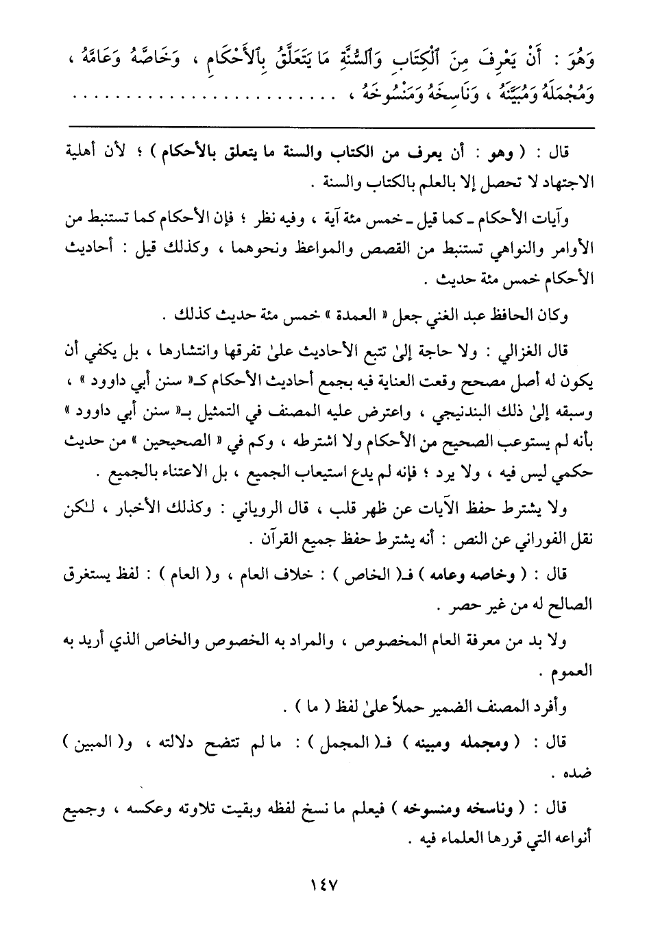 وَهُوَ: أَنْ يَعْرِفَ مِنَ الْكِتَابِ وَالسُّنَّةِ مَا يَتَعَلَّقُ بِالأَحْكَامِ، وَخَاصَّةُ وَعَامَّهُ، وَمُجْمَلَهُ وَمُبَيَّنَهُ، وَنَاسِخَهُ وَمَنْسُوخَهُ،