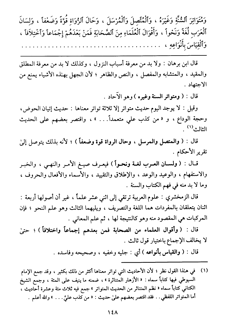 وَمُتَوَاتِرَ السُّنَّةِ وَغَيْرَهُ، وَالْمُتَّصِلَ وَالْمُرْسِلَ، وَحَالَ الرُّوَاةِ قُوَّةً وَضَعْفًا، وَلِسَانَ الْعَرَبِ لُغَةً وَنَحْوًا، وَأَقْوَالِ الْعُلَمَاءِ مِنَ الصَّحَابَةِ فَمَنْ بَعْدَهُمْ إِجْمَاعًا وَاخْتِلاَفًا، وَالْقِيَاسَ بِأَنْوَاعِهِ،