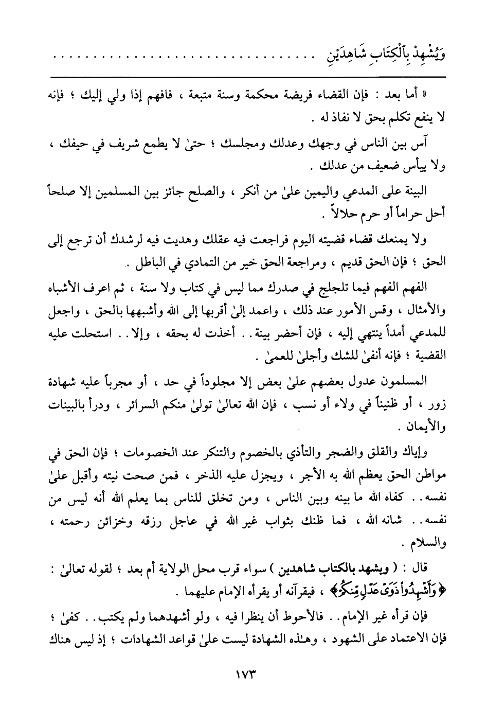 الفهم الفهم فيما تلجلج في صدرك مما ليس في كتاب ولا سنة، ثم اعرف الأشباه والأمثال، وقس الأمور عند ذلك، واعمد إلى أقربها إلى الله وأشبهها بالحق، واجعل للمدعي أمدًا ينتهي إليه، فإن أحضر بينة .. أخذت له بحقه، وإلا .. استحلت عليه القضية؛ فإنه أنفى للشك وأجلى للعمى.