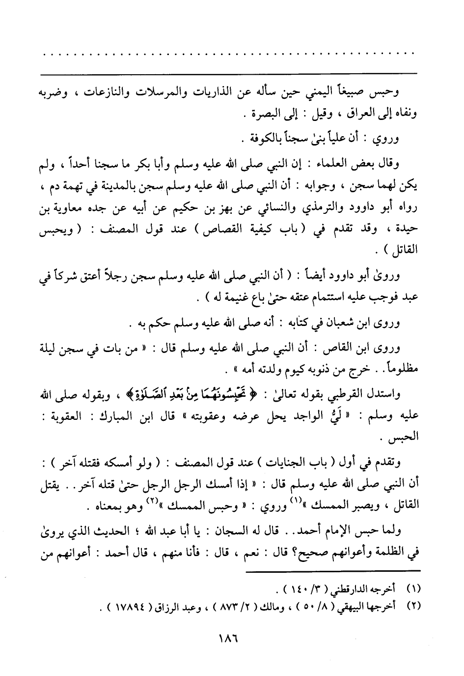 وقال بعض العلماء: إن النبي صلى الله عليه وسلم وأبا بكر ما سجنا أحدًا، ولم يكن لهما سجن، وجوابه: أن النبي صلى الله عليه وسلم سجن بالمدينة في تهمة دم، رواه أبو داوود والترمذى والنسائي عن بهز بن حكيم عن أبيه عن جده معاوية بن حيدة، وقد تقدم فى (باب كيفية القصاص) عند قول المصنف: (ويحبس القاتل).