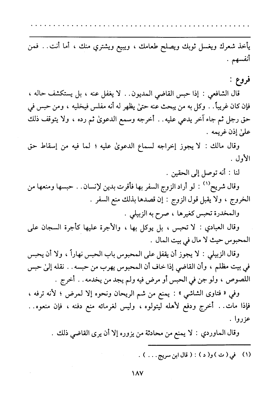 وقال الزبيلي: لايجوز أن يقفل على المحبوس باب الحبس نهارًا، ولا أن يحبس فى بيت مظلم، وأن القاضي إذا خاف أن المحبوس يهرب من حبسه .. نقله إلى حبس اللصوص، ولو جن في الحبس أو مرض فيه ولم يجد من يخدمه .. أخرج.