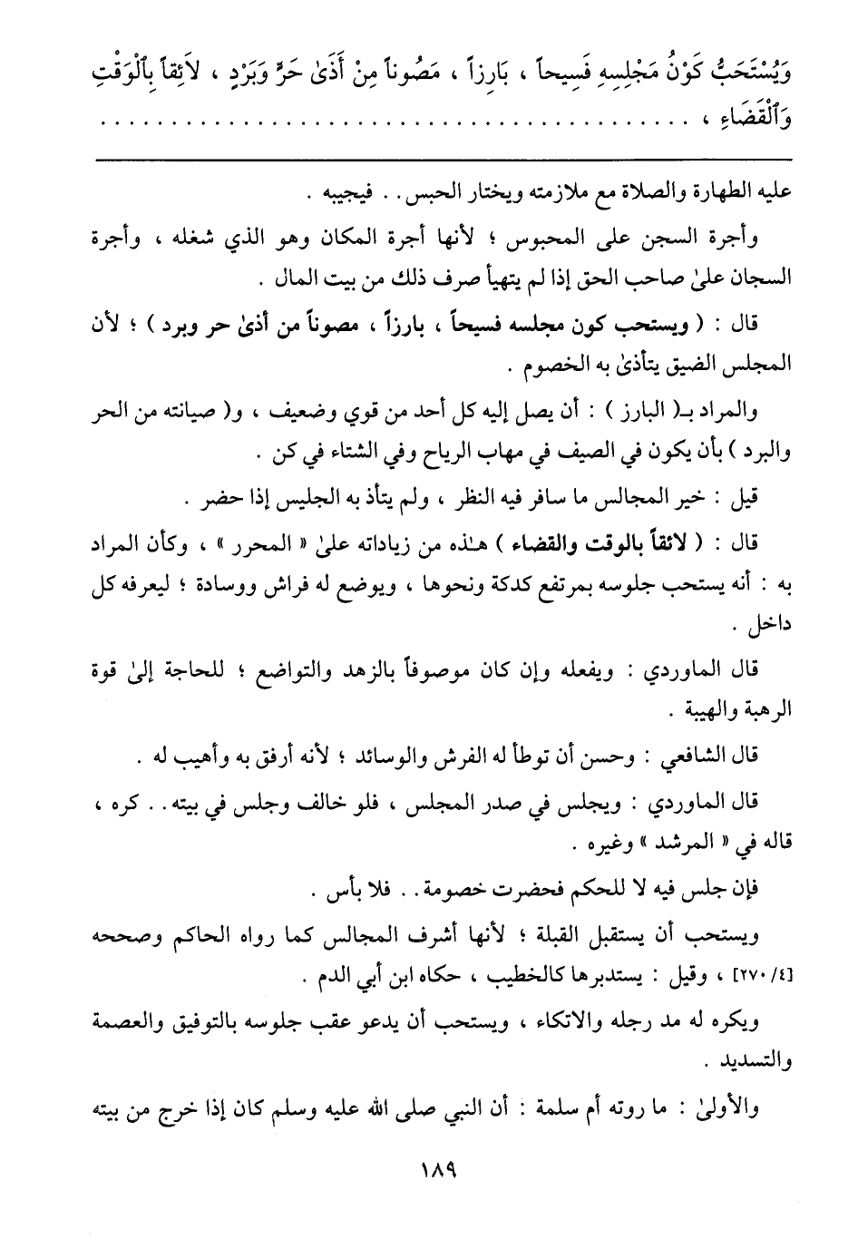 قال: (ويستحب كون مجلسه فسيحًا، بارزًا، مصونًا من أذى حر وبرد)؛ لأن المجلس الضيق يتأذى به الخصوم