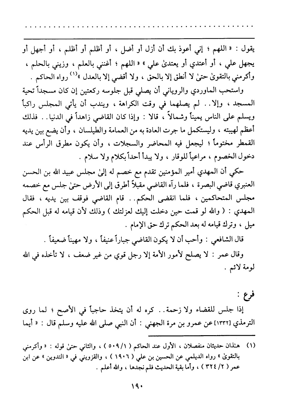 حكى أن المهدى أمير المؤمنين تقدم مع خصم له إلى مجلس عبيد الله بن الحسن العنبري قاضي البصرة، فلما رئه القاضي مقبلًا أطرق إلى الأرض حتى جلس مع خصمه مجلس المتحاكمين، فلما انقضى الحكم .. قام القاضي فوقف بين يديه، فقال المهدي: (والله لو قمت حين دخلت إليك لعزلتك) وذلك لأن قيامه له قبل الحكم ميل، وترك قيامه له بعد الحكم ترك حق الامام