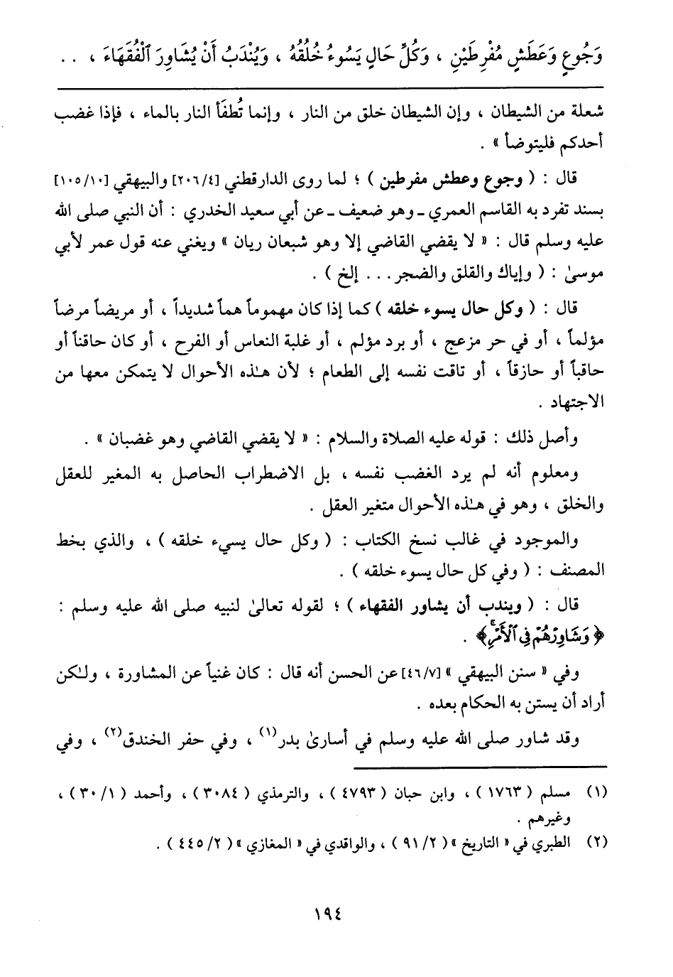 قال: (ويندب أن يشاور الفقهاء)؛ لقوله تعالى لنبيه صلى الله عليه وسلم: (وشاورهم في الأمر).