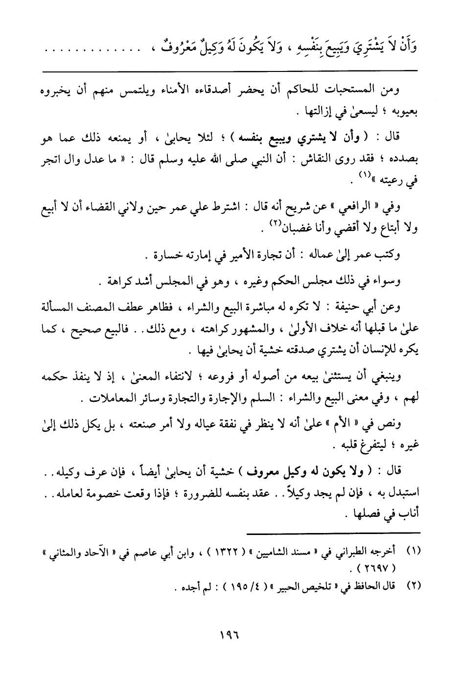 قال: (وأن لا يشتري ويبيع بنفسه)؛ لئلا يحابى، أو يمنعه ذلك عما هو بصدده؛ فقد روى النقاش: أن النبي صلى الله عليه وسلم قال: (ما عدل وال اتجر في رعيته)