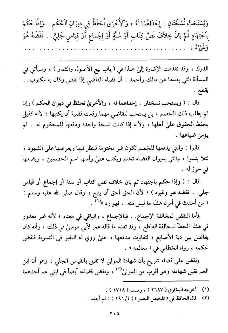 وَيُسْتَحَبُّ نُسْخَتَانِ: إِحْدَاهُمَا لَهُ، وَالأُخْرَى تُحْفَظُ فِي دِيوَانِ الْحُكْمِ. وَإِذَا حَكَمَ بِاجْتِهَادٍ ثُمَّ بَانَ خِلَاف نَصِّ كِتَابٍ أَوْ سُنَّةٍ أَوْ إِجْماعٍ أَوْ قِيَاسٍ جَلِيٍّ .. نَقَضَهُ هُوَ وَغَيْرُهُ،