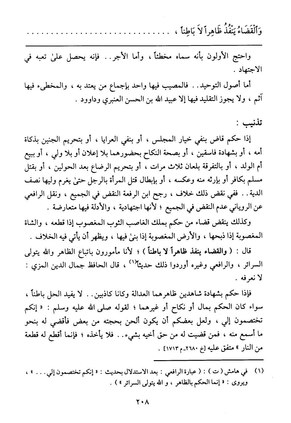 قال: (والقضاء ينقذ ظاهرًا لا باطنًا)؛ لأنا مأمورون باتباع الظاهر والله يتولى السرائر، والرافعي وغيره أوردوا ذلك حديثًا، قال الحافظ جمال الدين المزي: لا نعرفه.