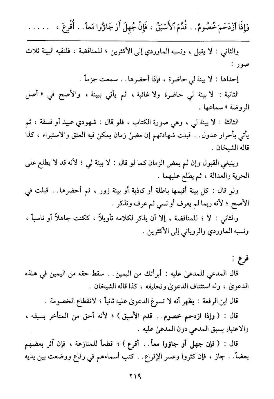 وَإِذَا ازْدَحَمَ خُصُومٌ .. قُدِّمَ الأَسْبَقُ، فَإِنْ جُهِلَ أَوْ جَاؤُوا مَعًا .. أُقْرِعَ،