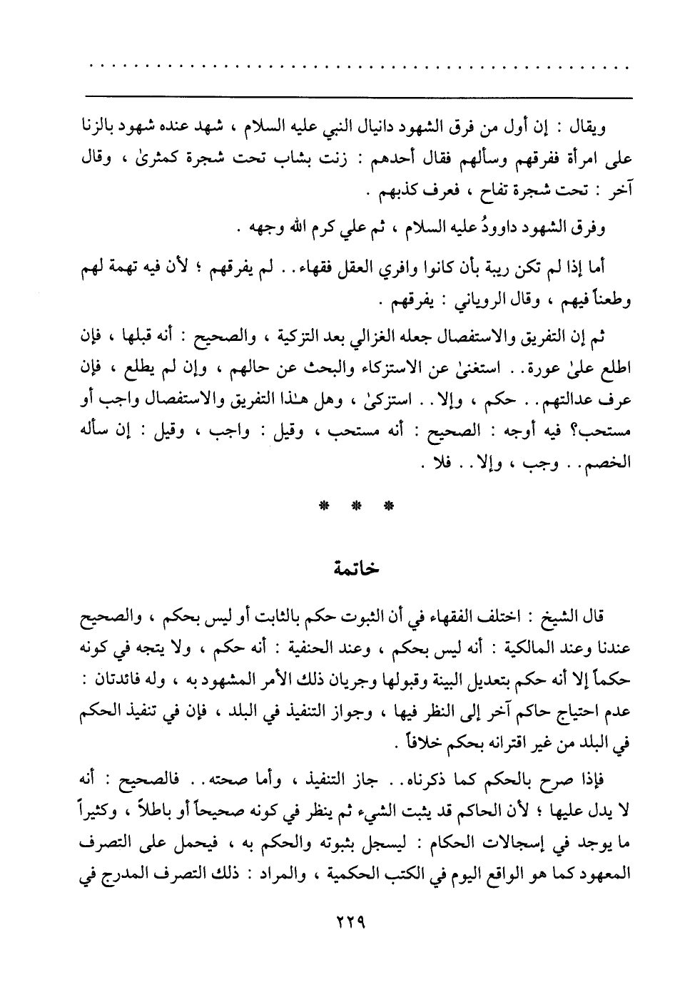 ويقال: إن أول من فرق الشهود دانيال النبي عليه السلام، شهد عنده شهود بالزنا على امرأة ففرقهم وسألهم فقال أحدهم: زنت بشاب تحت شجرة كمثرى، وقال آخر: تحت شجرة تفاح، فعرف كذبهم.