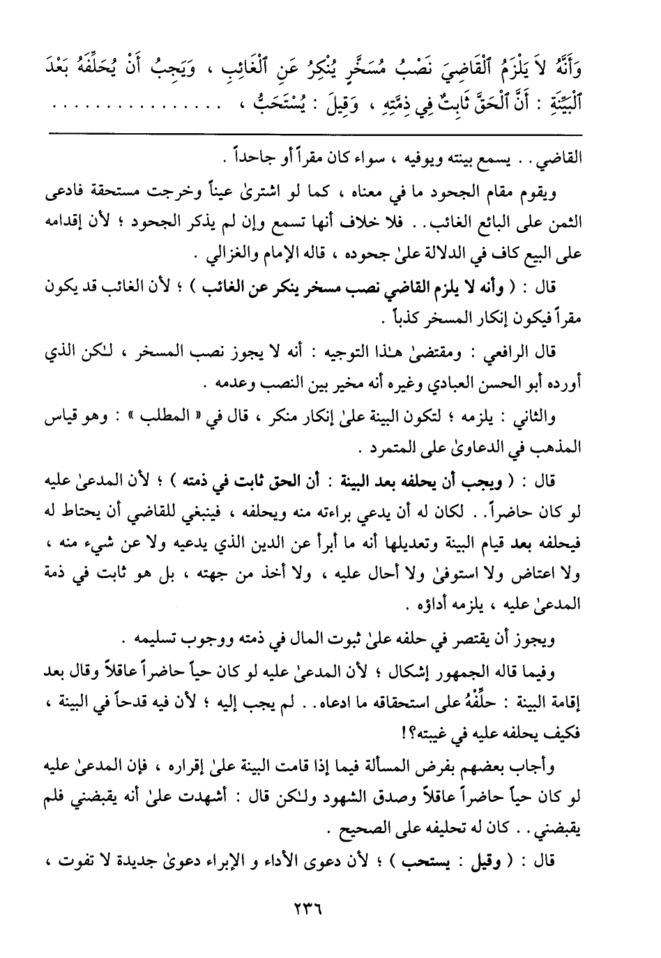 وَأَنَّهُ لاَ يَلْزَمُ الْقَاضِيَ نَصْبُ مُسَخَّرٍ يُنْكِرُ عَنِ الْغَائِبِ، وَيَجِبُ أَنْ يُحَلَّفَهُ بَعْدَ الْبَيِّنَةِ: أَنَّ الْحَقَّ ثَابِتٌ فِي ذِمَّتِهِ، وَقِيلَ: يُسْتَحَبُّ،